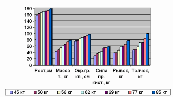 Анализ показывает, что рост спортсменов имеет тенденцию увеличения с повышением групп весовых категорий на 7,4 % (при p<0,05), (у сборников Украины- 12,1 %, p<0,05). В 1- й и 2- й группах рост выше, а в 3- й- меньше. Анализ свидетельствует, что только у спортсменов 1- й группы получены достоверные отличия между молодыми тяжелоатлетами и сборниками Украины (t=2,5). В других группах разница роста недостоверна. Другой критерий- пропорции тела молодых и взрослых спортсменов- характеризует уровень физического развития и предоставляет сравнить его с физическим развитием молодых сборников Украины. Показатель отношения окружности талии к окружности грудной клетки больший у спортсменов сборной команды Украины во всех группах весовых категорий, но достоверных отличий не выявлено. Показатель окружности плеча к окружности грудной клетки в 1- й группе одинаков, а во 2- й и 3- й больше у сборников Украины. Только во 2- й группе получена статистическая достоверность (p<0,05). Показатель окружности бедра к окружности грудной клетки во 2- й и 3- й группах больше у сборников Украины, а в 1- й- меньше. Достоверных отличий не получено. Показатель окружности икроножной мышцы к окружности бедра в 1- й и 3- й группах больший у сборников Украины, но не достоверен, а во 2- й- меньший. Во второй группе получена статистическая достоверность (p<0,05). Показатель Эрисмана имеет свои особенности: в 1- й и 2- й группах больший у сборников Украины, но не достоверен, а в 3- й- меньше. Отличия показателей в 3- й группе статистически достоверно (t=3,9). Отмечается также увеличение этого показателя у атлетов 2- й и 3- й групп, сравнено с 1- й (p<0,05). Показатель крепости телосложения в 1- й и 2- й группах меньше у сборников Украины, но достоверен лишь во 2- й группе (p<0,05). В 3- й группе- выше, но разница отличий статистически не достоверна. Показатель динамометрии кисти имеет тенденцию увеличения с возрастанием весовых категорий. Отличия показателей во 2- й и 3- й в сравнении с 1- й имеет статистическую достоверность (p<0,05). Относительная величина мышечной силы кисти является объективным показателем, так как рост силы в процессе тренировки во многом связан с увеличением массы тела [10]. Для всех трех групп весовых категорий величина мышечной силы кисти имеет высокий показатель. Приведены показатели физического развития младших юношей (13- 15 лет) (рис. 1). Анализ показывает, что рост с повышением весовых категорий также имеет тенденцию к увеличению на 12,8 %. В весовой категории до 45 кг- 156,6+ 2,6; 50- 164,7+ 2,6 (p< 0,05); 56- 167,0+ 3,9; 62- 170,6+ 1,8; 69- 173,0+ 0,6; 77- 174,0+ 2,5; 85- 176,5+ 1,0 (см). В остальных весовых категориях достоверных отличий не выявлено. Масса тела соответственно: 43,3+ 1,3; 47,8+ 0,1; 54,5+ 0,6; 60,1+ 0,4; 65,9+ 0,2; 73,0+ 0,8; 79,9+ 0,6 (кг). Отличия показателей статистически достоверны (p< 0,05). Окружность грудной клетки: 77,6+ 1,1; 78,7+ 0,7; 85,7+ 0,9 (p< 0,05); 88,1+ 0,5 (p< 0,05); 91,5+ 0,2 (p< 0,05); 92,5+ 0,9; 98,0+ 0,7 (p< 0,05) (см). Динамометрия правой кисти: 29,5+ 1,2; 35,6+ 2,2; 42,5+ 0,8; 45,0+ 0,7; 56,0+ 0,6; 58,5+ 1,0; 65,0+ 3,6 (кг). Разница показателей статистически достоверна (p< 0,05) во всех категориях, кроме 85 кг. Средний результат в рывке: 38,6+ 2,6; 41,0+ 1,0; 51,6+ 0,1; 59,0+ 0,2; 66,0+ 3,5; 70,0+ 0,6; 81,5+ 2,3 (кг). Достоверность различий (p< 0,05) присутствует во всех категориях, кроме 77 кг. Средний результат в толчке: 50,0+ 1,8; 50,0+ 1,0; 61,0+ 0,7; 71,5+ 0,7; 79,0+ 3,1; 92,5+ 3,8; 103,0+ 2,4 (кг). Разница результатов статистически достоверна (p< 0,05) во всех весовых категориях, кроме 50 кг. Приведено сравнение показателей физиче