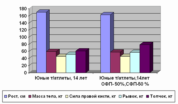 Рис. 2. Сравнение показателей физического развития и физической подготовленности юных тяжелоатлетов (14 лет) с другими тяжелоатлетами (14 лет, ОФП- 50 %, СФП- 50 %) Выводы. 1. Осуществлен анализ отличий показателей физического развития и физической подготовленности молодых и юных тяжелоатлетов различных весовых категорий, которые ведут подготовку к соревнованиям и участвуют в них. 2. Ростовые данные молодых и юных тяжелоатлетов имеют тенденцию к увеличению с повышением групп весовых категорий на 7,8 и 12,8 %. 3.Показатель отношения окружности талии к окружности грудной клетки повышается с увеличением групп весовых категорий, но статистически достоверен лишь у спортсменов 2- й группы (p< 0,05). Другие показатели пропорций тела имеют отличия в разных группах весовых категорий у молодых и взрослых спортсменов, но статистически достоверны только во 2- й. Отношение окружности икроножной мышцы к окружности бедра- спортсменов областных соревнований (p< 0,05). 4. Показатель Эрисмана в 3- й группе выше у спортсменов областных соревнований и статистически достоверен (p< 0,05), а показатель крепости телосложения меньший, но не достоверен. 5. Средние результаты в рывке и толчке у юных тяжелоатлетов 3- й группы (14 лет) (ОФП- 50 %, СФП- 50 %) выше, чем у юных тяжелоатлетов областных соревнований (14 лет) и проверены своей достоверностью (p< 0,05). Дальнейшие исследования предполагается провести в направлении изучения других проблем подготовки в различных группах юных тяжелоатлетов. Литература