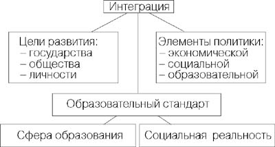 Рис. 1. Интеграция целей элементов политики, социальной реальности в образовании Основными признаками ОС являются: - ориентированность на цели образования; - тенденция к ориентации на конечный результат; - интеграция научных знаний; - многоуровневый характер построения; - учет экономической культуры (психофизические нагрузки образования на организм обучающегося); - приоритетность выбора курса на высокие национальные стандарты [1]. ОС характеризуется: 1) уровнем общей и профессиональной культуры общества; 2) формированием у обучающегося адекватной современному уровню знаний и уровню образовательной программы (ступени обучения) картины мира; 3) интеграцией личности в национальную и мировую культуру; 4) формированием человека и гражданина, интегрированного в современное ему общество и нацеленного на совершенствование этого общества; 5) воспроизводством и развитием кадрового потенциала общества [15]. Развитие ОС представляет собой эволюцию способов нормирования образования и образованности (рис.1). Процесс рефлексии (анализа) ОС может включать следующие вопросы: 1) какого типа развития политика? 2) развития для кого? 3) с какой целью? 4) каким образом? Ответы на данные вопросы позволяют решить проблему интеграции элементов социальной, экономической и образовательной политики государства. Функции OC - это способы его воздействия на образование как на систему, на субъекты образовательного процесса, а также интегративные формы взаимодействия "потребителей" образования. В.И. Байденко (1999) выделяет следующие функции образовательного стандарта: 1) организационно-управлен ческую; 2) развивающую; 3) прогностическую; 4) преемственности; 5) конвертирующую.