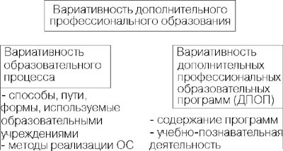 Рис. 2. Схема вариативности ДПО "Организационно-управленческая функция ОС - это упорядочение и регламентация качественных и количественных характеристик образовательной системы, посредством которых обеспечивается контроль за образованием со стороны личности, государства, общества, работодателя и др." [1]. "Развивающая функция - функция оптимизации образовательного процесса и образовательных политик с точки зрения предoставления личности условий для ее актуального и потенциального развития" [2]. "Прогностическая функция ОС - функция, которая позволяет объективировать оценку результатов образования, обеспечивая тем самым престиж образования, образованности и достаточную "высоту" образовательного стандарта" [1]. "Функция преемственности ОС - это "обеспечение взаимосвязи и взаимозависимости всех звеньев и ступеней образования в условиях диверсифицированной образовательной системы" [1]. "Конвертирующая функция образовательного стандарта - это интернаци онализация качества образования, гарантирующего личности географическую мобильность в плане ее компетентности" [1]. Вариативность является объективной характеристикой образования, так как даже при унификации учебных планов, программ, норм в образовательный процесс включены его субъекты (обучающие и обучающиеся), "чьи индивидуальности принципиально не устранены из воспитания и обучения "[1]. На рис. 2 представлена схема вариативности ДПО. ОC должен обладать социально-специфическими нормами, так как по отношению к нормированию он как тип проектирования образования представляет собой явление не техническое, а социально-специфическое. Литература 1. Байденко В.И. Стандарты в непрерывном образовании: концептуальные, теоретические и методологические проблемы /Монография. - М.: Исследовательский центр проблем качества подготовки специалистов. 1999. - 296 с. 2. Валицкая А.П. Модели образовательных систем и подходы к стандартизации //Образовательные стандарты: Материалы международного семинара. - СПб.: Образование. 1995. 3. Валицкая А.П. Философские основания современной парадигмы образования //Педагогика, 1997, № 3, с. 15 -19.