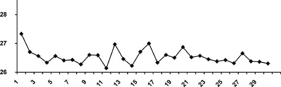 Ниже (см. рисунок) представлена динамика результатов проплывания 50-метровой дистанции стилем баттерфляй одного из участников эксперимента (А. П-к, 24 года, мс). Участие в эксперименте данного спортсмена было интересно еще и потому, что его предыдущая работа с достаточно известным московским тренером была малоэффективна - спортсмену ни разу не удалось повторить выполненный им задолго до этого норматив мастера спорта.