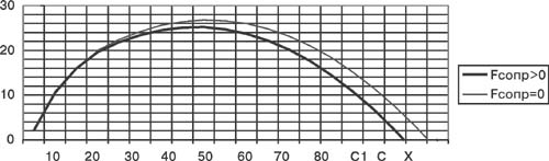 Из табл.1 видно, что для достижения максимальной дальности (Xc >85 м) в идеальном случае, без учета сопротивления воздуха, молоту необходимо сообщить скорость V0 = 29 - 30 м/с. Произведем оценку уменьшения дальности полета молота, вызванную влиянием силы сопротивления воздуха. Известно, что сила сопротивления при движении тела в воздухе определяется соотношением: Fсопр = Cx r V2 Sмид/ 2. Спортивный снаряд молот - это шар массой 7,257 кг, диаметром d>112 мм, на тросике с ручкой длиной 117-121 см. Для дальнейших расчетов примем: вес mg = 71,1 Н, диаметр d = 12 см, длина l = 120 см. Площадь миделева сечения Sмид = 1.13.10 - 2 м2. Плотность воздуха r = 1,2 кг/м3. Коэффициент лобового сопротивления Cx зависит от числа Рейнольдса Cx = f (Re). Число Рейнольдса Re = r V d / m, где m =1,01,10-3 кг/м с - коэффициент динамической вязкости воздуха. Для наших условий (V0 = 30 м/с, r = 1,2 кг/м3, d = 12 см) получаем значение числа Re " 5,3 103. Для тела в форме шара по графику Cx = f(Re) из монографии (Г. Шлихтинг "Теория пограничного слоя") находим значение Cx=0,4-0,45. Максимальное значение силы сопротивления в момент выброса молота (V0 = 30 м/с) равно Fсопр(0) = 0,4х1,2х302х1,13 х10 -2 / 2 = 2,75 Н. Заметим, что в действительности сопротивление молота из-за наличия ручки и тросика больше, чем сопротивление шара (Fсопр.мол >Fсопр.шар), и уменьшается по мере движения снаряда. Оценки показывают, что коэффициент сопротивления поводка и ручки молота на порядок меньше коэффициента сопротивления самого шара. Видим, что сила сопротивления составляет 3,8% от силы тяжести. Уравнение движения молота в проекциях на координатные оси имеет вид: m ax = - Fсопр x, где Fсопр x = Fсопр(0) cosa; m ay = - mg - Fсопр y, где Fсопр y = Fсопр(0) sina. Допустим, что составляющие силы сопротивления молота (Fсопр x , Fсопр y) остаются постоянными во время движения (допущение 1) и равными максимальным значениям силы сопротивления для шара в начальный момент времени (допущение 2). Эти два допущения оказывают противоположное действие на конечный результат, частично компенсируют друг друга и существенно облегчают решение уравнений движения. При названных допущениях движение молота вдоль оси ОХ будет равнозамедленным с ускорением ax = - Fсопр x / m; вдоль оси ОУ - равнозамедленным до вершины В1 с ускорением ay = - g - Fсопр y/m и равноускоренным после вершины В1 с ускорением ay = + g - Fсопр y/m. Это обстоятель ство позволяет целиком выполнить кинематический расчет траектории движения молота. Результаты расчета представлены ниже. Исходные данные: V(0) = 30 м /с; a(0)=45°. Данные расчетов: Vх(0) = Vу(0) = 21,2 м/с ; Fсопр x (0) = Fсопр у (0) =1,73 Н = const. Составляющие ускорения: ах = -0,24 м/с2; ау = -10,05 м/с2 (до вершины В1); ау = + 9,57 м/с2 (после вершины В1 ). Время полета до вершины В1 t(OB1) = Vу(0) /ay = 2,10 с. Координаты вершины: Хв1 =Vх(0) t(OB1 )- ах t(OB1)2/2 = 44,08 м. Ув1 = Vу(0) t(OB1) - ау t(OB1)2/2 = 22,5 м. Скорость в вершине Vх(В1) = Vх(0) - ах t(OB1) = 20,68 м / с Нисходящая ветвь траектории (участок В1С1). Как уже отмечалось выше, движение молота после вершины В1 - равноускоренное с ускорением ау = + 9,57 м/с2. Высота падения Ув1с1 = ау t(B1 С1)2/2. Отсюда время падения t(B1 С1) = 2,16 с. Общее время полета молота t(общ) = t(OB1) + t(B1 С1) = 2,10 + 2,16 = 4,26 с. Дальность нисходящей ветви траектории (рис.1): Хв1с1 = Vх(В1) t(B1 С1) - ах t(B1 С1)2/2 = 44,0 м Общая дальность: Хобщ = Хов1 + Хв1с1 = 88,08 м. Сравнивая полученные результаты для t(общ) и Хобщ с результатами расчета, приведенными в табл.1, видим, что расчетное время движения отличается от tc идеального на 0,06 с (на 1,4%), а дальность 