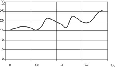 Рис. 2. Анализ расчетных данных, приведенных в табл. 2, позволяет сделать следующие выводы. Ускорение по модулю на восходящей ветви траектории всегда больше ускорения на нисходящей ее ветви. Время полета молота до вершины траектории - точки В1- меньше времени полета молота от точки В1 до точки С1. Дальность участка на восходящей ветви траектории несколько больше дальности на ее нисходящей ветви. Попутный ветер увеличивает дальность траектории, а встречный ветер - уменьшает дальность броска при одинаковой начальной скорости. Графики на рис. 2 наглядно показывают, что влияние внешних условий приводит к образованию "коридора" в значении дальности при одних и тех же параметрах выполнения броска. Это связано с изменением величины силы лобового сопротивления при изменении относительной скорости обтекания молота. Указанные выводы не противоречат физическому смыслу в рамках рассматриваемой траекторной задачи. Перейдем теперь к анализу движения молота на первой стадии [4, 5, 3, 2]. В учебнике "Легкая атлетика"[4] дан подробный анализ движений метателя молота в разных фазах. В учебно-методическом плане очень полезными можно считать кадры киносъемки вращений и поворотов с молотом ведущих метателей молота [5]. Еще более ценными представляются материалы кинематического анализа движений метателя и самого молота во время поворотов. Такой материал с анализом кинограммы броска Ю. Бакаринова на 66,7 м представлен в работе[5]. Полученный график скорости молота V = f (t) в поворотах носит принципиальный характер (рис. 3) и для разных метателей отличие будет состоять только в абсолютных значениях цифр (скорость-время) для характерных точек первой стадии броска. Заметим, что Ю. Бакаринов, не обладающий выдающимися для метателя физическими данными (рост - 169 см, вес - 100 кг), но имеющий отличные для данного времени скоростные качества и координацию движений, показывал устойчивые результаты в метании молота. Кинограммы бросков Бакаринова - наглядное пособие для тренеров и спортсменов. Анализируя кинограмму его броска, можно отметить, что в 3-м повороте приращение скорости на максимуме составляет всего 0,9 м/с, а минимальная скорость (молот находится в верхней точке) равна 18,2 м /с, т.е. чуть больше, чем при размахиваниях молотом (Vм = 17,1 м/с). И только мощное и своевременное финальное движение, когда метатель действует на молот с усилием ~ 1350 Н, позволяют сообщить снаряду приращение импульса D(mV)" 48 кгм/с, довести скорость вылета Vo до 25,6 м/с и совершить бросок за 66 м при сравнительно небольшом угле (a0=38 град) вылета молота. Если бы минимумы скорости в поворотах составляли 19, 20 и 21,5 м/с соответственно, а за счет финального усилия приращение скорости составляло 6,5 м/с, то дальность броска при той же скорости выполнения движений равнялась бы приблизительно 80 м. Но это было 30 лет назад, в настоящее время требования и класс спортсменов возросли, а это означает, что все движения в предварительных вращениях, поворотах и в финальной стадии надо делать быстрее хотя бы на 0,05 - 0,08 с. Таблица 2. Расчет кинематических величин (Fconp <> 0)