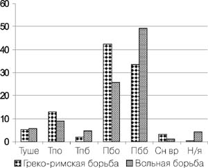 Анализ структуры побед на олимпийском турнире в Сиднее (табл. 4 и 8 и рис. 1) показал, что у борцов вольного стиля чаще всего имеют место победы по баллам с баллами у проигравшего (49,3%), победы по баллам без баллов у проигравшего (25,8%) и технические победы без баллов у проигравшего (9,0%); у борцов греко-римского стиля победы распределились следующим образом: победы по баллам с 0 у соперника - 42,4%, победы по баллам с баллами у соперника - 33,5%, чистые технические победы с 0 у соперника - 13,0%.