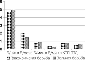 Рис. 2. Показатели соревновательной деятельности у борцов греко-римского и вольного стиля