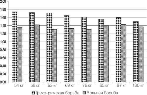 Таблица 1. Показатели соревновательной деятельности участников разных весовых категорий (вольная борьба) в Олимпийских играх в Сиднее
