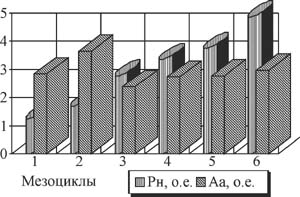 Рис. 6. Мезоцикловая динамика неорганического фосфора (Рн) и аминного азота (Аа) у квалифицирован ных пловцов