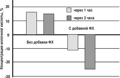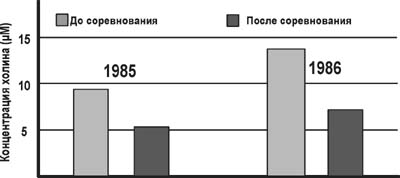 Рис. 3. Изменение концентрации холина в плазме крови бегунов Бостонского марафона 1985 и 1986 гг. [34, 36] Подобная длительная физическая нагрузка показала снижение уровня плазменного холина приблизительно на 40% [34, 36]. Аналогичные результаты были установлены у пловцов [37] и велосипедистов [19, 38]. Считается , что снижение свободного холина в плазме приводит к дефициту нейромедиатора ацетилхолина и как следствие наблюдается снижение выносливости и физической активности спортсмена и ускоренное утомление мышц [39]. Препараты фосфатидилхолина восстанавливают организм после нагрузки. Подтверждение того, что препараты , содержащие ФХ, примененные до физической нагрузки, способны как минимум поддерживать содержание плазменного холина в течение длительного упражнения на исходном физиологическом уровне, было получено рядом исследователей [35, 37]. Все эксперименты были проведены на хорошо тренированных атлетах с использованием велотренажеров и на велосоревнованиях . Исследования проводили по правилам плацебо-контролируемых клинических испытаний . Аналогичные результаты были получены при испытании добавок ФХ у бегунов на длинные дистанции [19, 37]. Утомление мышц при длительном физическом упражнении, как уже было сказано, коррелирует с истощением плазменного холина. В то же время применение добавок ФХ до соревнований, не позволяя запасам холина истощаться, уменьшает чувство психологической усталости, а в некоторых случаях даже улучшает настроение [40 - 45], увеличивает ощущение силы и повышает результативность у пловцов [40, 44, 45]. Фосфатидилхолин и объективные критерии восстановления организма . Одним из объективных параметров, отражающих накопление мышечной усталости и перенапряжения организма, является концентрация молочной кислоты в крови. На рис. 4 представлены результаты изменения концентрации молочной кислоты в крови через 1 и 2 ч после соревнований. Очевидно, что использование добавки ФХ снижает концентрацию молочной кислоты. Молочная кислота - важный промежуточный продукт обмена веществ. В мышцах она образуется как конечный продукт ферментативного анаэробного расщепления углеводов. Мышечное утомление преимущественно связано с накоплением молочной кислоты и сопровождается закислением мышц. Другой объективный показатель физического состояния тренирующегося организма - частота сердечных сокращений (ЧСС). ЧСС во время физической нагрузки и в период восстановления пульса - важный показатель тренированности и выносливости организма [46]. Экспериментально доказано, что использование препаратов ФХ до соревнований приводит к более быстрому восстановлению ЧСС [37].