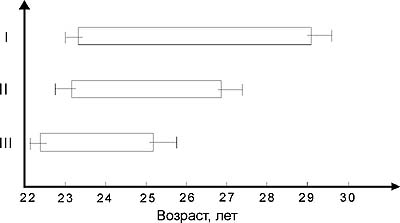 Рис. 1. Возрастные границы этапа стабилизации высших достижений лучших дзюдоистов мира (n = 140) согласно весовым категориям: III - 60-71 кг; II - 78-86 кг; I - 95-оpen. В Сеуле (1988) во второй раз стали призерами Олимпийских игр девять дзюдоистов. В весовой категории до 86 кг победил австриец Петер Зайсенбахер, повторивший свой успех четырехлетней давности и ставший двукратным олимпийским чемпионом. А в тяжелой весовой категории (свыше 95 кг) в Сеуле, как и в Лос-Анджелесе, золотую медаль вновь выиграл японец Хитоси Сайто. Француз Марк Александр, который на Играх 1984 г. был бронзовым призером в весовой категории до 65 кг, в Сеуле-88 стал олимпийским чемпионом в весовой категории до 71 кг. Ким Я Юп (Корея), завоевавший в Лос-Анджелесе (1994) серебрянную награду в весовой категории до 60 кг, в Сеуле (1988) в той же весовой категории стал олимпийским чемпионом. Поляк Януш Павловский, который на Играх 1980 г. в Москве был бронзовым призером в весовой категории до 65 кг, вынужденно пропустив Игры в Лос-Анджелесе-84, на Играх в Сеуле завоевал серебряную медаль. Обладателем серебряной олимпийской награды (в весовой категории до 78 кг) в Сеуле стал Франк Винеке (ФРГ), который за четыре года до этого в Лос-Анджелесе выиграл золотую медаль. Чо Ён Чул (Корея), который в 1984 г. был бронзовым призером в тяжелой весовой категории (свыше 95 кг), в Сеуле-88 повторил свой успех, вновь завоевав бронзовую медаль. Бельгиец Роберт ван де Валле - олимпийский чемпион Лос-Анджелеса (1984) в весовой категории до 95 кг - в 1988 г. в Сеуле стал обладателем бронзовой награды. Еще один олимпийский чемпион Лос-Анджелеса - японец Синдзи Хосокава (весовая категория до 60 кг) - в Сеуле завоевал бронзовую медаль. На Олимпийских играх в Барселоне (1992) только Вальдемар Легень (Польша, весовая категория до 86 кг) повторил свой успех, завоевав вторую золотую медаль: на Играх в Сеуле-88 он первенствовал в весовой категории до 78 кг). На Олимпийских играх в Атланте-96 пять дзюдоистов сумели во второй раз войти в число призеров. В весовой категории до 65 кг Удо-Гюнтер Квельмальц из Германии, который на Играх в Барселоне-92 был бронзовым призером, через четыре года в Атланте выиграл золотую медаль. В тяжелой весовой категории (свыше 95 кг) француз Давид Дуйе, на Играх в Барселоне завоевавший бронзовую награду, в Атланте стал олимпийским чемпионом. Японец Тосихико Кога, победивший на Играх 1992 г. в весовой категории до 71 кг, через четыре года, перейдя в весовую категорию до 78 кг, стал серебряным призером. В весовой категории до 60 кг немец Рихард Траутман завоевал в Атланте, как и в Барселоне, бронзовую медаль. Повторил свой бронзовый успех и кубинец Исраэль Эрнандес (весовая категория до 65 кг). На Играх в Сиднее (2000) во второй раз олимпийскими призерами стали шесть дзюдоистов. Японец Тадахиро Номура (до 60 кг), как и в Атланте (1996 г.), выиграл в Сеуле золотую медаль. Также двукратным олимпийским чемпионом (в 1996 и 2000 гг.) стал француз Давид Дуйе (свыше 95 кг), у которого с учетом его бронзовой награды, завоеванной в 1992 г. в Барселоне, теперь есть олимпийские медали уже трех Игр. Голландец Марк Хузинга, в 1996 г. ставший бронзовым призером в весовой категории до 86 кг, в 2000 г. в Сиднее выиграл золотую олимпийскую медаль в весовой категории до 90 кг. Чо Ин Чул (Корея), который в Атланте был бронзовым призером в весовой категории до 78 кг, в Сиднее завоевал серебряную медаль в 