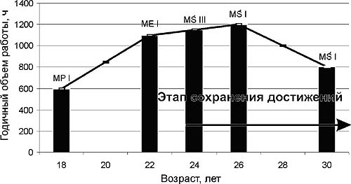 Рис. 3. Динамика тренировочных нагрузок двукратного чемпиона мира Р. Кубацкого. MP - чемпионат Польши; ME - чемпионат Европы; MS - чемпионат мира Первый фактор, способствующий продолжительному удержанию спортивной формы, - это введение значительных отличий в подготовку на рассматриваемом этапе по сравнению с предыдущим, характер которых во многом был обусловлен учетом сохранения адаптационных ресурсов одними функциональными системами организма и их исчерпанности в других [10]. Введение значительных организационно-методических изменений в систему подготовки обеспечивалось несколькими основными путями. Один из них предполагал изменения в соотношении тренировочных нагрузок различных по характеру энергетического обеспечения и величине. Другой путь предполагал длительные периоды снижения объема тренировочной работы с резким уменьшением доли ее специального компонента, сокращением и даже временным прекращением соревновательной практики. Такой вариант был характерен для выдающихся борцов, которым удалось победить на нескольких Олимпийских играх. Третий вариант связан с более существенным, чем на предыдущим этапе, использованием колебаний, прежде всего на уровне макро- и мезоциклов подготовки. Второй фактор - ярко выраженная индивидуализация подготовки спортсменов с акцентом на совершенствовании их сильных сторон. Примером этого может быть построение подготовки лучших дзюдоистов мира на рассматриваемом этапе. Третий фактор - постепенное уменьшение объема тренировочной работы при сохраняющейся на прежнем уровне ее интенсивности. Ни у одного из охваченных исследованием олимпийских чемпионов и чемпионов мира продолжительное сохранение достижений не было связано с повышением общего объема тренировочной работы (примером может служить динамика тренировочных нагрузок двукратного чемпиона мира Рафала Кубацкого, Польша) (рис. 3). Попытки же некоторых спортсменов реализовать обратное к успеху не привели; неизбежное исчерпание адаптационного ресурса и связанное с ним снижение функционального потенциала, во многом обусловленное предшествующей напряженнейшей подготовкой к высшим достижениям, не позволяют осваивать прежние по объему нагрузки [16]. Четвертый из рассматриваемых факторов - это ориентация спортсмена на главные соревнования в году, а также увеличение длительности переходных периодов тренировочных макроциклов, в ходе которых особое внимание уделяется восстановлению и профилактике заболеваний. Целесообразность подобного построения годичной подготовки подтверждают многие выдающиеся тренеры. Об этом свидетельствуют и индивидуальные примеры лучших дзюдоистов мира - двукратного чемпиона Олимпийский игр В. Легеня (Польша) и двукратного чемпиона мира и чемпиона Олимпийских игр П. Настули (Польша). Обсуждение. Результаты проведенных исследований показывают, что возрастной границей для достижения максимальных результатов служит возраст 32 года, тем более что это достижение удерживается довольно долгое время (с 1972 г.). С того времени конкуренция на международной арене значительно обострилась и повторение этого результата кажется сомнительным. Исключительно высокие спортивные достижения (двукратная олимпийская победа) принадлежат узкому кругу дзюдоистов - представителям тяжелых весовых категорий. Появ