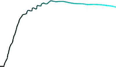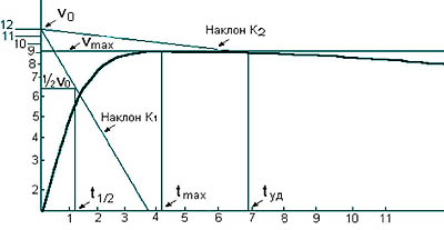 Рис. 1. Спидограмма спринтерского бега Цель исследования. Целью настоящего исследования явилось изучение эффективности применения препаратов полилактата в повышении уровня спортивных достижений в беге на короткие дистанции. В исследованиях приняли участие 17 спринтеров высокой квалификации - КМС и МС. Во время эксперимента спортсмены тренировались по утвержденным тренировочным планам под руководством тренеров. В лабораторном тесте МАМ испытуемые выполняли серию упражнений с установкой на достижение максимальной частоты педалирования при продолжительности усилий в 10 с с постоянной величиной сопротивления. Отдых между повторениями был равен 1 мин. Тест выполнялся на велоэргометре "Монарк" (Швеция). Для изучения динамики скорости в спринтерском беге испытуемым было предложено повторное пробегание дистанции 100 м с низкого старта в полную силу через 1 мин отдыха до выраженного снижения скорости бега. Время преодоления дистанции измерялось с точностью до 0,01 с с помощью системы фотоэлектронного хронометрирования и засекалось по началу движения спортсмена. Беговое контрольное испытание спортсмены выполняли по очереди, в каждом забеге бежал один участник. Фотоэлектронный хронометраж выполнялся с помощью измерителя скорости и временных интервалов ИСВИ-1 (производство ВИСТИ). Для определения кислотно-щелочного равновесия (КЩР)в каждом тесте производили забор проб крови в покое перед началом работы, после 5, 10, 15-го повторения и после прекращения теста на 3-й мин. Показатели КЩР крови выявляли на микроанализаторе BMS-2М фирмы "Радиометр" (Дания). Для регистрации скорости бега был использован спидографический метод. Спидограммы записывались с помощью спидографа, сконструированного по принципу В.М. Абалакова. Пример записи скорости бега приведен на рис. 1. При расчете основных параметров кривой скорости бега применяли графоаналитический метод, где в качестве математической модели изучаемого явления было использовано биэкспоненциальное уравнение, предложенное Ф.М. Генри. Для этого с полученной спидограммы для отдельных отметок времени считывались соответствующие значения скорости, которые откладывались на полулогарифмическом графике рис. 2.