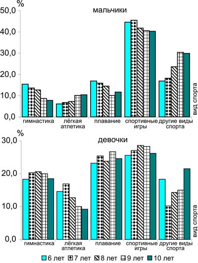 Рис. 1. Предпочтительность видов спорта для детей 6-10 лет Так, весомость мотива "люблю, нравится" имеет тенденцию к убыванию по мере увеличения возраста. Если у детей подготовительной к школе группы этот мотив является основным для 47,7% мальчиков и 51,2% девочек, то у учащихся 10 лет - для 23,4 и 24,6% соответственно, но он остается одним из главных во всех возрастных группах. Второе место по значимости у детей 6-8 лет занимает мотив "интересно, весело". Для учащихся 9-10 лет значимость данного мотива уменьшается, а желание стать сильными, ловкими, гибкими в процессе занятий физической культурой и спортом увеличивается и выходит на второе место. В 6 лет ему оказали предпочтение в среднем 6,3% мальчиков и девочек, в 9-10 лет - соответственно 20,8 и 13,3%. Начиная с 8-летнего возраста увеличивается значимость мотива "для укрепления здоровья", который не отмечается детьми 6-7 лет. Во всех возрастных группах у детей обоих полов остается желание научиться плавать и в процессе занятий физическими упражнениями пообщаться со сверстниками. Причем последний мотив для детей 6-7 лет находится на третьем месте и с возрастом его весомость уменьшается, но он остается значимым для 3,9% мальчиков и 7,7% девочек 10 лет. По мере взросления отмечены увеличение количества мотивов, побуждающих детей к занятиям физической культурой и спортом, и изменение их ценностных ориентаций. К 10 годам потребность учащихся в занятиях обусловливается желанием укрепить характер, волю, повысить уровень знаний в физкультурно-спортивной области. Наличие мотивов и потребности детей 6-10 лет можно условно объединить в три группы. К первой группе мотивов, которые отражают удовлетворение детей самим процессом физкультурно -спортивной деятельности, по нашему мнению, можно отнести: "люблю, нравится", "интересно, весело", "пообщаться со сверстниками", "возможность испытать себя". Вторую группу мотивов, объединяющих потребность детей в результатах деятельности, составляют: "расширить знания", "укрепить здоровье", "укрепить характер, волю". Третья группа мотивов, характеризующих потребность детей в перспективе физкультурно-спортивной деятельности, включает в себя такие, как "стать сильным, ловким, гибким", "научиться плавать". В отдельную группу, которая трудно поддается интерпретации, можно отнести мотивы "по желанию родителей", "для разнообразия". Заключение. Изучение возрастных особенностей мотивов и потребностей детей 6-10 лет к различным видам физкультурно-спортивной деятельности позволило установить следующее: - неодинаковые потребности мальчиков и девочек в занятиях различными видами спорта и достаточно высокий интерес у детей 6-10 лет обоего пола к игровым видам; - наличие различных тенденций в динамике мотивов к видам физкультурно-спортивной деятельности в группах мальчиков и девочек; - изменение ценностных ориентаций детей и увеличение по мере их взросления количества мотивов, побуждающих к занятиям физическими упражнениями.
