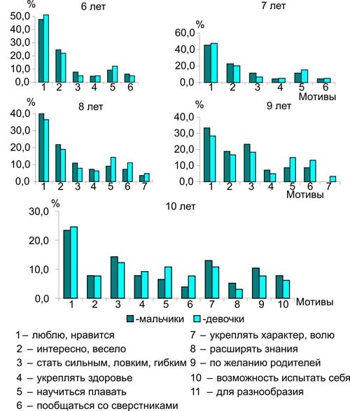 Введение. Понятия "мотивация" и "мотив", по утверждению Р.С. Немова (1995), являются основными среди всех понятий, используемых в психологии для объяснения побудительных мотивов в поведении человека. Мотивацию можно определить как совокупность причин психологического характера, объединяющих поведение человека, его направленность и активность (Б.Г. Ананьев, 1994). Установлено что, организация работы в системе массовой физической культуры построена без учета мотивов и потребностей людей разного возраста и пола в приобщении к регулярным занятиям физическими упражнениями (В.К. Бальсевич, 1996; Л.И. Лубышева, 1997; А.В. Лотоненко, 1998). В данной статье представлены результаты определения возрастной динамики предпочтительности различных видов физкультурно-спортивной деятельности детьми 6-10 лет. Организация и методы исследования. В исследовании приняли участие 135 мальчиков и 156 девочек 6-10 лет дошкольных образовательных учреждений № 31 и 131 и общеобразовательных школ № 10 и 35 г. Краснодара. Полученные данные интерпретировались дифференцированно по мальчикам и девочкам. Мотивационно-потребностная сфера детей в области физической культуры и спорта выявлялась с помощью анкетирования. Результаты исследования и их обсуждение. В социологических исследованиях определена приоритетность различных видов спорта для детей 6-10 лет (рис. 1). Обозначенные на рисунке родственные виды спорта объединены в группы: гимнастика - спортивная, художественная, основная, атлетическая, акробатика; легкая атлетика - отдельные виды специализаций (бег, прыжки, метания); плавание - синхронное, подводное, скоростное; спортивные игры - баскетбол, волейбол, гандбол, футбол, теннис. Самым популярным видом занятий у дошкольников 6 лет оказались спортивные и подвижные игры. Ими занимаются 44,6% мальчиков и 25,6% девочек. С возрастом интерес детей к спортивным играм сохраняется и к 10 годам ими занимаются или желают заниматься 40,3% мальчиков и 26,2% девочек. Интерес мальчиков к занятиям гимнастикой и плаванием по мере взросления уменьшается, а у девочек остается практически без изменений. Количество занимающихся и желающих заниматься плаванием девочек в среднем во всех возрастных группах в 2 раза больше, чем мальчиков . В отношении к занятиям легкой атлетикой также наблюдаются неодинаковые тенденции у детей различных полов. Так, если количество желающих заниматься данным видом спорта в 6 лет составляло 6,1% у мальчиков и 14,6% у девочек, то к 10 годам эти показатели соответствовали 10,4 и 9,2%. С возрастом увеличивается число учащихся общеобразовательных школ, предпочитающих заниматься другими видами спорта - стрельбой, восточными единоборствами, греблей, конным спортом, велоспортом, причем данная тенденция более выражена у мальчиков. Мотивы, побуждающие детей заниматься тем или иным видом физкультурно-спортивной деятельности, анализировались по наиболее часто встречающимся ответам на вопросы: "Почему ты хочешь заниматься выбранным видом спорта?" и "Почему Вы выбрали именно этот вид спорта или форму физкультурных занятий?" Установлено, что возрастные изменения значимости отдельных мотивов разноплановы (рис. 2).