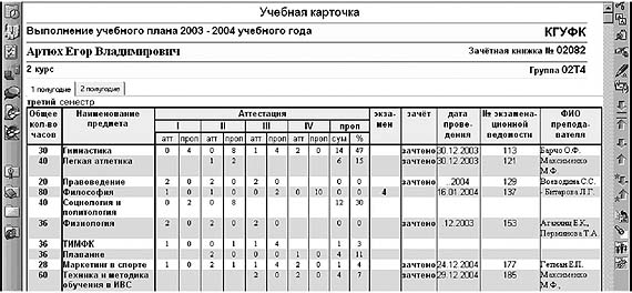 Рис. 6. Вид учебной карточки студента по окончании семестра