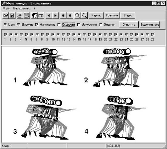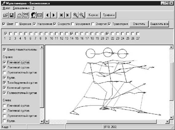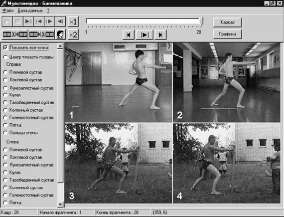 Рис. 1. База данных 1. Структурный анализ биомеханической системы "спортсмен" с помощью МПК "МБ". Данная процедура выполняется в полуавтоматическом режиме, т.е. на экране монитора вручную производится выделение суставов и других характерных точек на всех кадрах видеофрагментов технических действий в той последовательности, которая указана на панели управления (рис. 2). Для проведения исследования используется стержневая модель, описанная в [4]. Особеннос тью данной модели является то, что туловище спортсмена представляется в виде жесткой рамки. При выполнении техники каратэ-до позвоночный столб должен сохранять строго вертикальное положение, при этом его относительные подвижности исключаются. В этом случае моделирование туловища в виде рамки хорошо согласуется с реальностью [6]. Выделение звеньев спортсмена (на панели управления кнопка "КАРКАС"), определение их параметров (длина, вес звена, положение центра тяжести) и вычисление общего центра тяжести (о.ц.т.) системы выполняются в автоматическом режиме. 2. Кинематический анализ биомеханической системы "спортсмен" с помощью МПК "МБ". Данная процедура на основе промера (видеоциклог раммы) двигательного действия позволяет определить траектории движения, скорости и ускорения некоторых особых характерных для данной биомеханической системы точек (рис. 3). Построение видеоциклограммы (ВЦГ) двигательного действия производится в режиме "НАЛОЖЕНИЕ". С помощью выделения тех или иных кадров видеофрагмента можно формировать различные варианты отображения видеоциклограммы: разреженная (см. рис. 3) или полная (рис.4)). На рис. 4 показаны четыре ВЦГ, соответствующие техническим действиям на рис. 2.