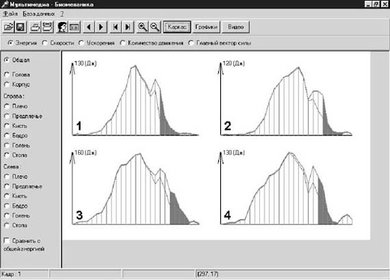 где j = 1, 2,..., к - индекс, определяющий номер кадра в видеоциклограмме; к - число кадров в видеофрагменте технического действия. Ускорения i-х точек биомеханической системы определяются как первые производные от скорости и также вычисляются по разностной схеме. Масштабирование, пересчет и соответствие размеров спортсмена, его перемещений, скоростей и ускорений на экране монитора с реальными производится в автоматическом режиме с учетом "эталона длины". При выполнении двигательных действий спортсмен формирует некоторое векторное поле скоростей и ускорений. О направленности данных векторных полей можно судить по направлениям векторов скоростей и ускорений особых, характерных точек биомеханической системы (i = 1, 2,..., n). На рис. 3 показаны один из вариантов векторного поля скоростей системы "спортсмен № 1" и его изменение с течением времени. 3. Динамический анализ биомеханической системы "спортсмен" с помощью МПК "МБ". Техника в каратэ-до определяется следующими характеристиками: скоростью о.ц.т. системы и скоростями рабочего звена (кулака, стопы и т.д.); силой удара (ударным импульсом силы); кинетичес кой энергией (энергоемкостью) технического действия. На рис. 5 представлены графики кинетических энергий выполнения техники "Ой-Дзуки" четырьмя рассматриваемыми спортсменами. Кинетическая энергия системы вычисляется при нажатии на панели управления позиции "Энергия" и выделении звеньев расчетной модели. При нажатии позиции "Количество движения" - вычисляется количество движения системы: