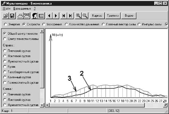 (устраняются) У спортсменов № 1 и 4 в момент контакта с мишенью (tнач.удара) и в конце ударного взаимодействия (tкон.удара) значительно различается количество движения системы, что создает достаточно большую силу удара. Уменьшение времени контакта руки спортсмена с мишенью при том же импульсе ведет к увеличению силы удара; 5) на рис. 8 представлены графики скоростей о.ц.т., правого плечевого сустава и правого кулака спортсмена № 1. Графики отражают переносное локомоторное движение спортсмена (Vо.ц.м.), относительное ротационно-скручивающее движение туловища (Vплеч.сустава) и относительное движение кулака (Vкулака). Совмещение и сравнение графиков наглядно показывает разделение медленных движений туловища и быстрых движений рук, а также их ранжированное волнообразное соединение в одну ударную технику (от медленных к более о.ц.м. быстрым). В момент начала удара происходит резкое торможение локомоторного и вращательного движений туловища, а скорости руки и кулака имеют максимальное значение. Эта модель похожа на разогнавшийся автомобиль, который резко затормозил и из которого "все что внутри" стремится вылететь под действием силы инерции. В рамках статьи ставилась задача продемонст рировать некоторые примеры и возможности сравнительного исследования, а не проведения глубокого сравнительного анализа спортивной техники. Выводы. 1. Одним из направлений развития и совершенс твования учебной дисциплины "Биомеханика" является применение в учебном процессе мультимедиа информационных технологий. "Погружение" пользователя в виртуальную, интерактивную среду области знания "Биомеханика" позволяет усилить гуманитарную направленность данного предмета. 2. Методико-программный комплекс "Мультимедиа биомеханика" обладает достаточно большими возможностями организации как качествен ного биомеханического исследования двигательных действий в различных видах спорта, так и сравнительного анализа полученных результатов между собой и с базой данных, что позволяет применять комплекс при совершенствовании спортивного мастерства, улучшении качества учебно-тре нировочного процесса и при выполнении УИРС. 3. В статье описана структура МПК "МБ", приводятся примеры проведения биомеханического исследования и сравнительного анализа двигательных действий предметной области "Каратэ-до". Полученные при этом данные и выводы могут широко использоваться для формирования частной биомеханики: "Биомеханика каратэ-до". Литература 1. Бутенин Н.В., Лунц Я.Л., Меркин Д.Р. Курс теоретической механики. Том 2. Динамика. - М.: Наука, 1971. - 464 с. 2. Дмитриев О.Б., Ахмедзянов Э.Р., Калинина Е.А. Методико-программный комплекс "Мультимедиа биомеханика" для исследования двигательных действий в восточных единоборствах //Восточные единоборства - воинское искусство, спорт и система оздоровления: Сб. статей по матер. междунар. научн.-практ. конф.,18 - 20 ноября 1998 г. /Под ред. Дмитриева О.Б. - Ижевск: УдГУ, 1998, с. 148 - 155. 3. Дмитриев С.В. Предметная область и теоретические основания антропоцентрической биомеханики //Гуманитаризация образования и гуманизация знания: поиск взаимодействия: Межвузовский сборник научных трудов. - Н. Новгород: Изд-во НГПУ, 1998. с. 97 - 102. 4. Донской Д.Д. Биомеханика с основами спортивной техники. - М.: ФиС, 1971. - 288 с. 5. Коренберг В.Б. Основы качественного биомеханического анал