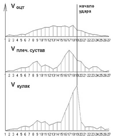 представляется в виде графиков 4. Рассмотрение ударных взаимодействий с помощью МПК "МБ". В качестве меры взаимодей ствия соударяющихся тел в теории удара рассматривают не сами ударные силы, а их импульсы [4]. Импульс силы вычисляется по теореме об изменении количества движения в интегральной форме [1]. Удар рукой состоит из трех основных фаз: фазы предварительного разгона (характеризуется переносной скоростью о.ц.т.); фазы ударного движения (определяется разгоном ударной руки до максимальной скорости) и затем ударного взаимодей ствия с мишенью (характеризуется временем удара и ударным импульсом). Анализ промера техники "Ой-Дзуки" показал, что длительность контакта руки (кулака) с мишенью составляет два-четыре кадра, т.е. 0,08-0,15 с.