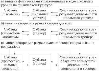 Информационная структура занятий физическими упражнениями и спортом (а, б, в), а также вклад участников этих процессов в физическую культуру с точки зрения психологической теории деятельности Теперь посмотрим через призму теории деятельности на некоторые средства физической культуры и разберемся, на что в человеке (на тело или на психику) они преимущественно действуют и чем являются для занимающихся с точки зрения психологии (см. таблицу). В таблице представлены только основные средства физической культуры, мы сознательно опустили, допустим, массаж, кратковременное голодание и т.п. В связи с работами Л.П. Матвеева, А.Д. Новикова [23], А.Н. Воробьева [6], В.А. Демина и его учеников [8, 11 - 13, 22 и др.] появилась возможность более тонко дифференцировать воздействие средств физической культуры на человека и особенно на его психику и формы общественного сознания. Дело в том, что интеллект - это способность мыслить, а без этого нет тактики и нет победы в спорте. Вместе с тем основная социальная функция олимпийского спорта высших результатов - миротворческая [11, 13 и др.]. Участие спортсмена в олимпийских играх заключается в том, чтобы в честной борьбе продемонстрировать свои психофизические и интеллектуальные способности ради мира на Земле, ради славы своей миролюбивой Родины. Разве это не проявление высочайшей нравственности как одной из форм общественного сознания? Правда, сам по себе спорт не делает человека нравственным. Важно, какая обстановка царит в обществе. Разве можно назвать отдельных спортсменов из США, Канады, ГДР и других стран нравственными людьми, если они при помощи допинга побеждали на олимпийских играх, нарушая принцип честной борьбы? Но это нельзя назвать и культурным явлением. Что же касается занятий подвижными играми, физическими упражнениями и спортом для всех, то с точки зрения психологии все они являются действиями в двигательной структуре учебы, труда, службы и т.п., и лишь спорт высших результатов благодаря наличию мотивации, связанной с высшим результатом, может быть отнесен к деятельности. Таким образом, из таблицы следует, что воздействие на человека специфических средств, используемых в нашей отрасли, выходит далеко за рамки телесного. В связи с этим считаем, что более корректно и с точки зрения науки более грамотно будет называть ее отраслью культуры тела и духа, понимая под духом эмоции, воображение, эстетику, мотивацию, волю, интеллект, нравственность как психические процессы, свойства и способности, а также формы общественного сознания. Теперь обратимся к рисунку, на котором представлена информационная структура занятий физическими упражнениями и спортом в рамках школьного урока, спорта для всех и олимпийского спорта высших результатов, а также вклад участников этих процессов в физическую культуру с точки зрения психологической теории деятельности . Стрелками показаны пути обмена информацией между участниками описываемых процессов. Относительно терминов "спортсмен-любитель" и "спортсмен-профессионал" можно сказать, что первым мы называем участников спорта для всех, а вторым - участников спорта высших результатов. Из рисунка следует, что школьников и спортсменов-любителей можно причислить к потребителям физической культуры, а школьных преподавателей предмета "физическая культура", тренеров и спор