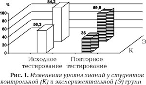 В экспериментальной группе улучшение этого критерия гораздо значительнее. Доля оценок "4" и "5" в начале занятий составила 6% от общего спектра результатов, а в конце возросла до 51,2%. Уровень знаний в экспериментальной группе студентов сразу после завершения курса обучения составил 82,4%, а через год снизился до 68,8%, в контрольной соответственно 62,4 и 41,8% (рис. 2).