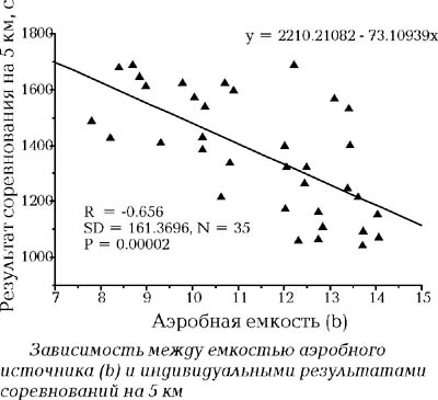 большой мощности юно Общеизвестен факт, что максимально точное представление о работоспособности дает специфическая соревновательная нагрузка. Дистанцию лыжных гонок на 10 км быстрее всех пробегали испытуемые аэробного типа энергетики - 2111,87±43,95 с. На пробегание той же дистанции лыжники смешанного и фосфатного типов затрачива ли достоверно большее время (p < 0,001), соответственно 2522,71±52,87 и 2676±62,92 с. Дистанцию 5 км спортсмены аэробного типа проходили в среднем за 1129,38±26,58 с. Лыжники смешанного и фосфатного типов - за 1406,46±38,9 и 1588±44,17 с, соответственно. Разница между типами статистически достоверна - p<0,01. Полученные данные позволяют предположить, что независимо от периода подготовки годичного тренировочного цикла тип индивидуальной организации энергообеспечения скелетных мышц определяет работоспособность лыжников-гонщиков в различных зонах мощности и результаты соревнований. Не меньший интерес представляет взаимосвязь индивидуальных эргометрических показателей, характеризующих возможности энергосистем, с работоспособностью спортсменов. Было показано [4], что у тренированных мужчин величина Wmax характеризует работоспособность в зоне максимальной мощности, W40 - субмаксимальной, W240 - большой, а W900 -умеренной мощности. Можно предполагать наличие взаимосвязи показателей W240, W900, b и с результатами соревнований.