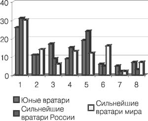 Рис. 3. Соотношение способов задержания мяча у исследуемых гандболисток-вратарей Общая результативность игры вратарей сильнейших команд на чемпионате мира на 10% (46:36%) превосходит результативность наших игроков. Обращает на себя внимание значительное различие результативности способа задержания мяча "двумя руками": 30 % у наших против 51% у сильнейших зарубежных. Вратари сильнейших команд мира при задержании нижних мячей часто применяют "шпагат", и результативность этого способа у них на 10 % выше, чем у наших соотечественниц. При этом, как показали наблюдения, наши спортсменки в такой ситуации предпочитают "выпад". В "шпагате" сильнейшие часто задерживают мяч двумя руками снизу (мяч летит между ногами) и сбоку с наклоном туловища, если не удается задержать его ногой. Кроме того, быстрый выпад позволяет им загораживать пространство всем туловищем, подставляя себя под удар. Поэтому зарубежные гандболистки значительно чаще принимают мяч "туловищем". Представляет интерес сравнительный анализ количества и результативности задержания мяча вратарями различного возраста и квалификации (рис. 3). Соотношение использования способов задержания мяча юными вратарями ближе к таковому у российских мастеров, а не у сильнейших зарубежных. Особенно это заметно при сравнении способов "выпад" и "шпагат". Как и у российских мастеров, у юных преобладает способ "выпадом" (19 %) при отражении низких мячей, а "шпагат" они применяют всего в 6% случаев: сказывается современная отечественная школа. Заключение. Для задержания мяча сильнейшие вратари мира и российские гандболистки суперлиги России применяют восемь основных способов. Количество применяемых в игре способов задержания мяча у игроков этого класса значительно не различается. Анализ способов задержания мяча в игре спортсменками различной квалификации выявил значительное различие в "школе" игры, причем не в пользу российских мастеров. Особенно различается применение способов "выпад" и "шпагат" при отражении низколетящих мячей. Российские гандболистки-вратари (и юные и взрослые мастера) мало используют способ "шпагат", который приносит успех сильнейшим вратарям мира. Чтобы выполнять способы сильнейших вратарей, необходима соответствующая физическая подготовлен ность, как силовая, так и особенно на гибкость. Количество и соотношение способов задержания мяча вратарями в 36 играх первенства суперлип. России