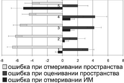 Для изучения точности восприятия времени и пространства у лиц с различным уровнем двигательной активности (ДА) часть обследованных была разделена на 5 групп: от первой к пятой группе уровень ДА снижался. К первой группе отнесены спортсмены высокой квалификации с наибольшим уровнем ДА (n=263), ко второй - спортсмены массовых разрядов (n=147), к третьей - лица, занимающиеся физической культурой (n=122), к четвертой - бывшие спортсмены (n=101) и к пятой - не занимающиеся спортом (n=97). Результаты исследования показали, что уровень ДА влияет на особенности восприятия времени и пространства. Наиболее короткая индивидуальная минута (ИМ) (57,5±0,74 с) отмечена в пятой группе (р<0,01), у них же выявлена наибольшая (5,15%) величина ошибки при ее воспроизведении (р<0,01) (см. рисунок). В первой и второй группах