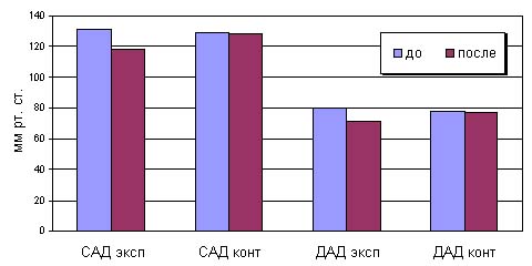 Рис. 2. Динамика изменения АД под влиянием стато-динамических упражнений до и после эксперимента Стабилизировался показатель, управляющий ритмом сердца, - величина амплитуды моды (АМо), снизившись с 23,4±7,8 до 14,3±3,7%. Вариационный размах DХ - параметр, отвечающий за влияние на сердечный ритм парасимпатического отдела ВНС, увеличился с 0,3 ± 0,1 до 0,4 ± 0,2 с (р < 0,05). В конечном итоге у девушек с проявлениями артериальной гипертонии снизился и стабилизировался показатель артериального давления, уменьшилась ЧСС в покое, исчезли такие субъективные реакции на ортостатическую пробу, как головокружение, потемнение в глазах, задержка дыхания, что рассматривается нами как позитивный результат использования стато-динамических упражнений. Полученные данные позволяют сделать заключение, что под влиянием экспериментальной оздоровительной методики занятий, использующей СДУ, происходит достоверное качественное и количественное улучшение большинства исследуемых параметров физической подготовленности, физического развития и функциональных показателей здоровья студенток специальной медицинской группы с диагнозом НЦД. Литература 1. Вейн А.М. Вегетативные расстройства: Клиника, лечение, диагностика. - М.: Медицинское информационное агентство, 2000, с. 52-108 с. 2. Горбачев В.В. Недостаточность кровообращения. - Минск: Вышейшая школа, 1999, с. 19-57, 74-86. 3. Лубышева Л.И. Физическая и спортивная культура: содержание, взаимосвязи и диссоциации// Теория и практика физ. культуры, 2002, № 3, с. 11-12. 4. Маколкин В.И., Аббакумов С.А. Нейроциркуляторная дистония в терапевтической практике. - М.: Медицина, 1985, с. 16-58. 5. Мякинченко Е.Б., Селуянов В.Н. Оздоровительная тренировка по системе Изотон. - М.: СпортАкадемПресс, 2001, с. 8-50. 6. Плотников В.П. Средства физической культуры в функциональной характеристике и оздоровлении студентов с нейроциркуляторной дистонией.: Автореф. докт. дис. М., 1995. - 32 с. 7. Селуянов В.Н. Технология оздоровительной физической культуры. - М.: СпортАкадемПресс, 2001, с. 62-75.