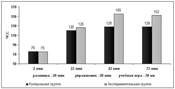 Динамика ЧСС в Э и К группах в течение учебно-тренировочного занятия в конце эксперимента Апробация экспериментальной программы проводилась с февраля по май 2001 г. и показала высокую сравнительную эффективность предложенной технологии. В Э студенты быстрее и качественнее осваивали игровые приемы, эффективнее действовали в игре. На протяжении всего семестра в Э был отмечен значительный рост показателей, характеризующих общую и моторную плотность занятий. Показатели ЧСС в Э в основной части учебно-тренировочного занятия к концу семестра достоверно превысили показатели ЧСС в К (см. рисунок). Средняя продолжительность игровых эпизодов в Э за время эксперимента увеличилась в 3,9 раза против 1,5 в К. Эти факты свидетельствуют о том, что реализация предложенной спортивно-педагогической технологии существенно повышает двигательную активность студентов в течение всего занятия. Таким образом, можно говорить о создании с ее помощью предпосылок повышения потенциала здоровья студентов. На основании результатов проведенных нами исследований можно сделать следующие выводы: 1. Конверсия технологии спортивной подготовки волейболистов в учебно-педагогический процесс по физической культуре на неспортивных факультетах вузов - эффективный путь оптимизации преподавания курса "волейбол" в рамках вузовской учебной программы. 2. Эффективному решению