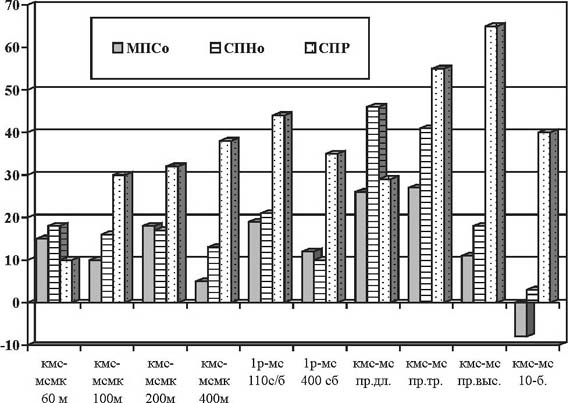 Рис.1. Зависимость роста спортивных результатов легкоатлетов от сократительных (МПСо, СПНо) и релаксационных (СПР) характеристик мышц