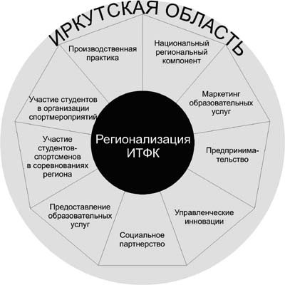 Модель регионализации управления техникумом физической культуры С учетом изложенного подхода нами систематизирован опыт ИТФК и построена соответствующая модель его регионализации. Рассмотрим кратко содержание каждого из названных направлений. Первое из них - маркетинг физкультурно -образовательных услуг ТФК. Для того чтобы выпускаемые ТФК дипломированные специалисты соответствовали спросу на них в регионе, необходимо: 1) выявлять на основе маркетинговых исследований потребности организаций региона в образовательных услугах ТФК и организовать работу по их удовлетворению (или иной вариант - рекламировать и продвигать предоставляемые техникумом образовательные и дополнительные непрофильные для него услуги и организовывать предоставление их как на коммерческой, так и на безвозмездной основе); 2) актуализировать содержание образовательного процесса ТФК в соответствии с интересами потребителей кадров техникума, потенциальными абитуриентами, потребностями и условиями регионального окружения. Предоставление населению региона образовательных услуг на безвозмездной основе. Сейчас ИТФК ведет подготовку специалистов по двум специальностям: 0307 - "Физическая культура" и 0202 - "Право и организация социального обеспечения", а также осуществляет дополнительное образование по этим специальностям. Формирование системы социального партнерства в регионе в качестве главной цели имеет содействие в трудоустройстве выпускников техникума в регионе. Техникум имеет многочисленные связи с Иркутским облспорткомитетом, областным департаментом образования, Иркутским горспорткомитетом, городским центром занятости и многими другими организациями Иркутского региона. Предпринимательство . В течение нескольких лет Иркутский ТФК активно развивает различные виды предпринимательства, предоставляя: сопутствующие услуги (профессиональная ориентация, создание подготовительных курсов, повышение квалификации и т.п.) и дополнительные услуги (сдача в аренду спортсооружений, организация физкультурно -оздоровительных и иных групп и т.п.). Так, в 2000 г. от предпринимательской деятельности в техникум поступило 4204,6 тыс. руб., в 2001 г. - 5901,6 тыс. руб., а за 2002 г. - около 10 млн руб. Эти средства используются на повышение заработной платы преподавательского и обслуживающего персонала техникума, реконструкцию материально-учебной базы и приобретение современных технических средств для учебного процесса, создание условий для спортивного совершенствования студентов, подготовки и выступления спортсменов и команд в различных спортивных соревнованиях. Инновационная деятельность в регионе 1. Выдвигая это положение, мы исходим из того, что ТФК, как правило, располагает высококвалифицированным коллективом специалистов, которым по силам обобщение опыта физкультурной и спортивной работы в регионе (области, республике, крае), разработка физкультурно-спортивных инноваций и предоставление их заинтересованным организациям. Не раскрывая подробно содержания разработанных в ИТФК управленческих инноваций, ограничимся только названием наиболее существенных из них. Это: - создание и организация работы Благотворительного Иркутского общественного фонда содействия спорту и туризму (1997 г.), - учреждение и издание бюллетеня "Физкультурное образование и спорт в Во