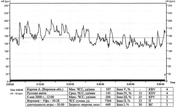 Рис. 2. Динамика ЧСС в игре с обоюдоострым нападением и защитой у спортсмена команды-победителя Помимо анализа соревновательной интенсивности игр команды изучались индивидуальная активность и характер ответных реакций у ведущих игроков в наиболее ответственных встречах. На рис. 1 приведена динамика пульсовой кривой игрока команды Воронежа в соревнованиях на Первенство России 2000 г. среди юношей 16 -18 лет в победном матче с серебряным призером командой г. Северска Томской области, завершившимся со счетом 53:27. Встреча прошла с преимуществом команды Воронежской области, которая переиграла своих соперников, совершив больше ТТД в нападении. Соответственно динамике соревновательной борьбы изменялась и функциональная активность в игре, что нашло свое отображение на приводимом рисунке. Величина пульса игрока в период матча изменялась со 135 до 198 уд/мин, среднее значение за игру составило 163 уд/мин. Соревновательная нагрузка по зонам интенсивности в игре распределилась следующим образом: в зоне V игрок соревновался 1 мин 30 с (выше индивидуальных значений пульса по результатам фитнес-теста), что составило 3%; в зоне IV - 18 мин, (36%); в зоне III - 22 мин 30 с (45%); в зоне II - 8 мин (и 3 мин тайм-аутов), что составило 16%. Общее время матча - 53 мин. Структура индивидуальных соревновательных действий была такова: количество выполненных ударов - 5, правильных ударов - 4, результативных ударов - 3, перебежек - 5, взятых свечей -1. На рис. 2 приведена динамика пульсовой кривой игрока команды Воронежа в полуфинальном матче с бронзовым призером - командой Уфы, завершившемся со счетом 30:28. Педагогические наблюдения позволили заключить, что встреча носила обоюдоострый характер с равномерным временным распределением игровых действий в нападении и защите. Причем для защитных ТТД характерна следующая динамика функциональной работоспособности: в зоне V игрок не соревновался; в зоне IV игра длилась 6 мин 1(2%); в зоне III - 12 мин 30 с (25%); в зоне II - 16 мин 30 с (33%); в зоне I игра продолжалась 15 мин (30%). Общее время матча - 51 мин (1 мин - тайм-аут). Величина пульса игрока в период матча изменялась со 107 до 204 уд/ мин, значение за игру составило 143 уд/мин. Структура индивидуальных СД была такова: количество выполненных ударов - 4, правильных ударов - 4, результативных ударов - 3, перебежек - 3, взятых свечей -3. Полученные данные стали основой для коррекции педагогического учебно-тренировочного процесса сборной Воронежской области по русской лапте. Спортсмены Воронежской области добились высоких результатов на Чемпионатах России: мужчины - 2000 г. - 1-е место, 2001 г. - 2-е место, 2002 г. - 3-е место; 2001 г. - чемпионы IV Всероссийских летних сельских спортивных игр; 1999, 2000 гг. - победители Первенства России среди юношей 16 -18 лет, 2002 г. - серебряные призеры; 2001 и 2002 гг. - студенты ВГАСУ стали чемпионами среди вузов, ССУЗов и общеобразовательных заведений. В итоге подготовлено 11 МС России по русской лапте и 10 КМС спорта резервного юношеского состава. Выводы Таким образом, тренировочную деятельность игроков в лапту необходимо строить с учетом основных параметров их СД. Современные тенденции развития игровой соревновательной деятельности юных и квалифицированных игроков в лапту характеризуются переходом от требований, предъявляемых к высокой динамичности игры юношей 16 -18 лет, выраженной количественными параметрами, движений