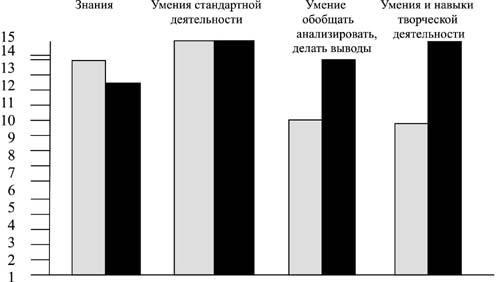 Работа на занятиях строилась по технологии индивидуального обучения, при которой индивидуальный подход и индивидуальная форма обучения являются приоритетами. На таких занятиях акцент делается главным образом на предметном контексте деятельности, в основе которого лежит приобретение ЗУН стандартной и творческой деятельности [1, 2]. Практические занятия предусматривали выполнение практических заданий с использованием творческой и самостоятельной деятельности студентов. По окончании эксперимента была проведена тестовая оценка уровней сформированности знаний, умений и навыков по модифицированной методике 4-уровневого освоения знаний В.П. Беспалько. Значительно большая успешность освоения знаний и интеллектуальных умений разноплановой методической деятельности отмечена в экспериментальной группе. Особенно ярко это выражено на втором, третьем и четвертом уровнях. Получены достоверные различия средних величин: на первом уровне при р< 0,005; на втором, третьем и четвертом - при р<0, 001. Дальнейший анализ данных, отраженных на диаграмме (см. рисунок), позволяет говорить об эффективности технологии проектов, которая позволила на четвертом уровне вывести студентов на достаточно высокие показатели. Таким образом, эксперимент показал, что технология проектов является одним из эффективных подходов в решении задач формирования знаний, практических умений и навыков через самостоятельный поиск студента. Литература 1. Вербицкий А.А. Игровые формы контекстного обучения. -М.: Знание, 1983. 2. Вербицкий А.А. Психолого-педагогические особенности контекстного подхода. М., 1997. 3. Питюков В.Ю. Основы педагогической технологии: Учебно-метод. пос., 3-е изд., испр. и доп. - М.: изд-во "Гном и Д", 2001. 4. Шлянов Е.Н., Котова И.Б. Развитие личности в обучении: Учеб. пос. для студ. пед. вузов. - М.: изд. центр "Академия", 2000, с. 129-160. 5. Якуник В.А. Педагогическая психология: Учеб. пос., 2-е изд. - СПб.: изд-во Михайлова В.А. 2000, с. 229-240.