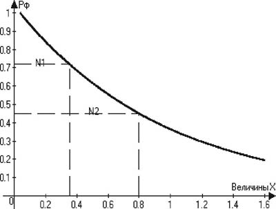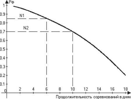 Рис. 1. Определение функциональной надежности (Рф) Наблюдения за динамикой функционального состояния моряков, выполненные А.С. Солодковым и В.В. Бердышевым [17], дали возможность авторам прийти к заключению о том, что длительное напряжение защитных сил организма в ряде случаев приводит к развитию дизадаптационных расстройств. Последнее проявляется в нарастающем снижении физической и умственной работоспособности, ослаблении неспецифической резистенстности, ухудшении функциональных возможностей физиологических систем организма. Эти обстоятельства определяют необходимость учета расхода адаптационной энергии, поскольку от ее наличия зависит сохранение функциональных возможностей организма при нагрузках, связанных со спортивной деятельностью [16]. Очевидно, чем больше израсходовано адаптационной энергии на поддержание функциональных возможностей и чем меньше ее осталось, тем выше вероятность срыва адаптации. С этих позиций вероятность сохранения функциональных резервов и возможность их срыва характеризуют несовместные (дизадаптационные) реакции [2-4, 15]. Как известно, сумма вероятностей несовместных событий равна единице (формула 6): Рфо+Рфос =1 (6), где Рфо - вероятность сохранения функциональных возможностей организма, Рфос - вероятность их срыва. Из выражения (6) можно заключить, что Рфос=1-Рфо . Поскольку сохранение функциональных возможностей организма является непременным условием спортивной деятельности и оно обусловлено расходом адаптационной энергии, по мере ее расхода возникает вероятность срыва этих возможностей. Поэтому представляется целесообразным использовать данную вероятность в качестве показателя расхода адаптационной энергии. С этой целью для измерения расхода адаптационной энергии может быть применена формула сложения вероятности двух несовместных событий и на ее основе построена номограмма расхода адаптационной энергии (рис. 2). Пунктирной линией N1 на рис. 2 показан расход адаптационной энергии сразу после нагрузки (см. табл. 2), а пунктирной линией N2 - ее расход через 4 ч после окончания нагрузки.