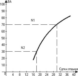 Рис. 5. Определение продолжительности отдыха в зависимости от развития астенического синдрома. ВА - процент лиц с астеническим синдромом в команде (социальный уровень - N2), выраженность астенического синдрома (индивидуальный уровень - N1), % Изложенный алгоритм информационно -вероятностного метода может найти применение не только при определении функциональной надежности физиологических систем организма спортсмена в реальных или прогнозируемых условиях спортивной деятельности, но и при комплексной оценке спортивной формы в ее вероятностной интерпретации в отношении достижения желаемого спортивного результата. В последнем случае в качестве нормативов используются функциональные, психоэмоциональные и спортивно-технические показатели, которые принимаются как эталонные для достижения поставленных спортивных задач. Литература 1. Алфимов Н.Н. Об использовании информационно-вероятностного метода для оценки тренированности спортсмена. Научные основы разработки и совершенствования технических средств обучения и спортивной тренировки /Сб. науч. тр. ГДОИФК им. П.Ф. Лесгафта, 1977, с. 26-30. 2. Алфимов Н.Н. Индекс комплексной оценки функционального состояния спортсмена /Доклады II Всемирного научного конгресса "Спорт в современном обществе". - М.: ФиС, 1980, с. 31-34. 3. Алфимов Н.Н. Количественная оценка стресса с позиций общей теории функциональных систем (спортивно-гигиенический аспект). Системные механизмы двигательной деятельности спортсмена. Волгоград, 1980, с. 25-29. 4. Алфимов Н.Н. Стресс: гигиенический аспект, количественная оценка. Научные основы спортивной гигиены /Сб. науч. тр. ГДОИФКа им. П.Ф. Лесгафта. Л., 1980, с. 15-64. 5. Алфимов Н.Н. Применение информационно-вероятностного метода для учета человеческого фактора в интересах Военно-Морского флота: Метод. реком. - СПб.: ВМедА, 2002. - 16 с. 6. Алфимов Н.Н., Морозько П.Н. Эколого-гигиенические основы прогнозирования состояния здоровья студентов-спортсменов: Метод. реком. - СПб: СПбГАФК им. П.Ф. Лесгафта, 2002. - 33 с. 7. Бамдас А.С. Астеническое состояние. - М.: Медицина, 1951. - 120 с. 8. Курпатов В.И., Юрьев Г.П. Диагностика предболезненных психосоматических состояний у корабельного состава. //Воен.-мед. журнал. 1995, № 3, с. 10-12. 9. Майстрах Е.В., Вайль Ю.С. Автоматическое управление физиологическими функциями в условиях патологии. - Л.: Медицина, 1978. - 134 с. 10. Новосельцев В.Н., Сальков Е.Е. Биологические системы. - М: БМЭ, изд. 3-е, 1976, с. 147-157, 428-457. 11. Селье Г. Стресс без дистресса. - М.: Прогресс, 1979. - 176 с. 12. Симонов П.В. Функции лимбических структур в свете информационной теории эмоций: Матер. симп. Баку, 1964, с. 15-23. 13. Симонов П.В. Предыстория воли. - М.: Наука и жизнь, 1970, № 7, с. 45-54. 14. Скернявичус И.П., Милажюс К.М., Могилевская Г.П. Влияние переменной тренировки на некоторые показатели биохимического состава кровуи у лыжников-гонщиков // Теория и практика физ. культуры, 1979, № 3, с. 21-24. 15. Солодков А.С. Физиологические основы адаптации к физическим нагрузкам: Лекция /ГДОИФК им. П. Ф. Лесгафта. Л., 1988. - 38 с. 16. Солодков А.С. Проблемы утомления и восстановления в спорте: Лекция / ГДОИФК им. П.Ф. Лесгафта. СПб., 1992. - 34 с. 17. Солодков А.С., Бердышев В.В. О развитии состояния физиологического напряжения у моряков при плавании в низких широтах //Воен.-мед. журн., 1972, № 7, с. 55-60. 18. Freidman M. Studies concerning the etiology and pathogenesis оf neurocirculatory asthenia //War. Med., 1944, № 6, p. 63-66.