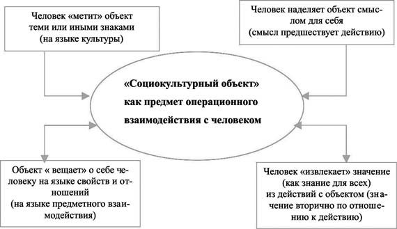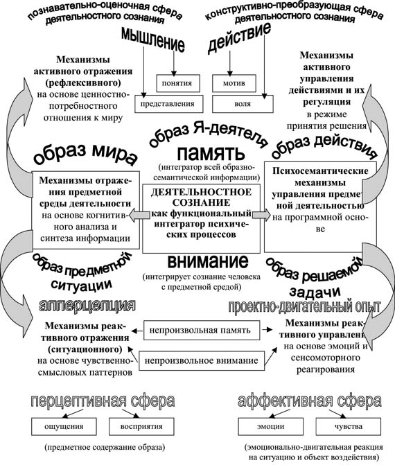 Рис. 1. Функциональная структура деятельностного сознания как инструмента познания и преобразова ния мира В рамках философской теории деятельности образовательная сфера (внутри которой человек обретает свою родовую сущность) представляет собой онтологически фиксируемое социопространство (связи и отношения с другими людьми) и индивидуальную предметную среду (физические ноумены и феномены). "Сфера бытия" человека чрезвычайно велика - от размеров вытянутой руки до Космоса (Вселенной, в которую "вселен" человек). Это своего рода социокультурное поле для развертывания рефлексивно-личностных процессов проектирования и построения духовно-практической деятельности, а культура, связанная с ценностно-смысловой сферой деятельностного сознания личности, предопределяет продукт и результат этой деятельности. Парадигма деятельностного сознания основана на трех "категориальных онтологиях": личность в развитии деятельности; деятельностное сознание в развитии рефлексии; деятельность в развитии сознания личности. Только становясь субъектом развития собственных социокультурных действий, человек обретает возможность стать личностью. При этом важно не просто "функционально запустить" требуемые стандартами образования профессиональные качества специалиста в той или иной сфере деятельности, а создать возможности для достижения человеком вершин своего развития (используя методы акмеологического проектирования, аффирмации, смысловой диверсификации и рефлексивной самоорганизации сознания личности). Здесь необходимо иметь в виду не только когнитивные механизмы отражения предметной среды, но и социокультурные механизмы формирования деятельностного сознания - формирование образа мира (мировосприятие, мировоззрение, мироинтерпретация), проектного отношения к миру (мироконструирование) и вписанной в этот образ системы духовно-практической деятельности . Главная эвристическая ценность парадигмы деятельностного сознания состоит в том, что в ней заложены мировоззренческие и регулятивные принципы , усваиваемые (осваиваемые) в ходе социализации человека. Указанные принципы лежат в основании механизмов познания и преобразования мира на основе формирования :1) общей концептуально-мировоззренческой системы человека и 2) деятельностной установки (операционно-технологической готовности и стремления к деятельности). Важно подчеркнуть конструктивную особенность построения концептуального образа мира: то, как он "открылся" человеку с помощью когнитивно-орудийных механизмов, на "языке практических действий". Социально-предметный мир понимается здесь как человеческий проект, а деятельность - как целесмысловая программа построения социокультурных, ценностно ориентированных двигательных действий. Отметим, что ценность относится не к сфере "материальных вещей" (вещи индифферентны), а к продуктивной деятельности человека, которая является ценностью средства для личности деятеля. Ценность, смысл, значимость - это не столько признаки объекта, сколько продукт (структура) семантического взаимодействия данного объекта с тезаурусом человека (рис. 2). Предметный мир человека как рефлексивно -личностный диалог. "Социокультурный синтез в системе образования - это не набор эталонизированных конструктов социального опыта, а открытая сист