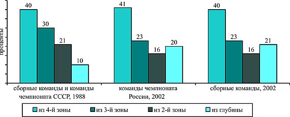 подача в прыжке в настоящее время - наиболее Проявляется тенденция к учащению случаев приема подачи сверху. Это объясняется тем, что арбитры матчей не стали предъявлять очень жестких требований к выполнению приема мяча, посланного подачей. Наблюдения показали, что прием сверху чаще применяется при планирующей подаче соперника или при слабом "накате". Прием сверху стал чаще использоваться также при игре в защите. В настоящее время арбитры встречи практически не фиксируют ошибок при игре в защите, позволяя игрокам отражать мячи любой частью тела. В технике различных видов нападающих ударов значительных изменений нет. В современном волейболе, как и ранее, наиболее распространенными являются нападающие удары по ходу, удары с переводом и обманные удары, причем их соотношение существенно не изменилось. Анализ технико-тактических действий (ТТД) волейболистов ведущих команд в нападении показал, что подавляющее большинство атак после хорошего приема подачи осуществляется с быстрых вторых передач. Данная тенденция характерна для ТТД в нападении из всех зон площадки. Наблюдается сокращение количества комбинаций в зоне 3 с использованием нападающих второго темпа. Характерная особенность современного волейбола - повышение доли атак из глубины площадки (рис. 1). В 80-е гг. 30% атак осуществлялось из зоны 3, в настоящее время их доля сократилась и составляет 23% в играх сборных команд и в чемпионате России. Таким образом, ведущие команды мира и России меньше используют атаки первым и вторым темпами из зоны 3. Данная тенденция связана с тем, что блокирующие в современном волейболе довольно часто группируются вблизи зоны 3 и связующие игроки, чтобы "растянуть" блок соперника, вынуждены больше использовать края сетки. Кроме того, длина тела многих волейболистов превышает 200 см, что облегчает им игру на блоке. Атаки из глубины площадки, которые в 80-е гг. были довольно редкими (всего 9,6%), в современном волейболе приобретают все большее значение. Причем эти атаки осуществляются не только из зоны 1, но и из зоны 6. Использование в атаке игроков задней линии позволяет во всех расстановках иметь трех активных нападающих, что значительно осложняет сопернику действия при блокировании.