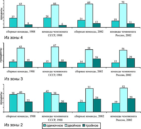 снижением при судействе Важной составной частью защитных действий является блокирование . На рис. 2 представлена характеристика результативного блокирования на разных этапах развития волейбола. Результативное блокирование нападающих ударов из зоны 4 характерно тем, что здесь преимущество имеет двойное блокирование по сравнению с одиночным и тройным. По сравнению с 80-ми гг. в современном волейболе отмечается некоторое увеличение результативного тройного блокирования и уменьшение результативного одиночного блокирования атакующих ударов из зоны 4. Иная картина результативного блокирования выявлена в зоне 3. В 80-е гг. удельный вес одиночного и двойного блокирования был примерно одинаковым (38-42%), значительно меньшей была доля тройного блокирования (20-22%). Данные наших исследований показали, что в современном волейболе увеличилась доля двойного блокирования и сократилась доля одиночного. При блокировании атак первым темпом центральному игроку часто помогают игроки зон 2 и 4, что раньше происходило значительно реже. Это стало возможным благодаря тому, что в настоящее время игроки передней линии при подготовке к блокированию группируются достаточно близко к зоне 3. Результативное блокирование в зоне 2 так же, как и в зоне 4, характеризуется преобладанием двойного блокирования над остальными. Наши исследования показали, что в настоящее время увеличилась доля результативного тройного блокирования в зоне 2. Это связано с усложнением подач в современном волейболе и как следствие - с увеличением частоты выполнения приема, после которого мяч не доведен точно до связующего игрока. В этих случаях нападающие удары выполняются, как правило, из зоны 4 с высоких передач при противодействии группового блокирования.