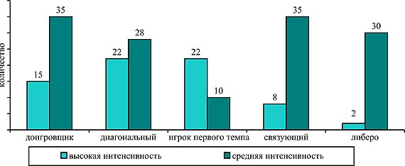 Рис. 3. Количество ТТД высокой и средней интенсивности за партию у волейболистов различных амплуа Заключение . Для классического волейбола на современном этапе характерны следующие тенденции, которые необходимо учитывать при планировании и проведении соревновательно-тренировочной деятельности высококвалифицированных волейболистов: 1) усложнение подачи, которая из технического элемента, обеспечивающего введение мяча в игру, превратилась в эффективное атакующее средство. Ведущие игроки мира имеют в своем арсенале 2-3 вида подач, которыми владеют в совершенстве. В настоящее время наибольшее распространение получили следующие виды подач: силовая подача в прыжке, планирующая силовая подача в прыжке, планирующая укороченная подача в прыжке, "накат" (укороченная подача); 2) ведущие команды мира используют диагонального игрока для приема силовой подачи (при максимальной степени риска) и игроков первого темпа для приема укороченной подачи. Сочетание различных видов подач предъявляет повышенные требования к физической и технической подготовленности игроков, участвующих в приеме; 3) усложнение подачи привело к увеличению доли атак в противодействии групповому блоку после плохого приема. Игроки, атакующие из зоны 2, из глубины площадки и особенно из зоны 4, вынуждены атаковать с высоких (не всегда удобных) вторых передач. ТТД ведущих команд мира в нападении после идеального и хорошего приема характеризуются равномерным использованием всех зон. Современный волейбол отличает увеличение доли атак из глубины площадки (зона 1 и зона 6); 4) изменения в правилах соревнований дают возможность командам более активно противостоять нападению соперника. Активизация защитных ТТД в современном волейболе сопровождается более частым использованием двойного и тройного блокирований. Введение игрового амплуа "либеро" также способствует более эффективной игре команд в защите; 5) классический волейбол на современном этапе своего развития характеризуется усилением различий в направленности соревновательной деятельности представителей различных игровых амплуа; 6) анализ соревновательной деятельности ведущих команд мира свидетельствует о возникновении потребности в универсально подготовленных высококвалифицированных волейболистах. Это особенно важно при подготовке резерва, когда принцип универсализации является ведущим. Использованная литература 1. Волейбол. Под ред. А.В. Беляева, М.В. Савина. - М.: ФОН, 2000. - 368 с. 2. Железняк Ю.Д., Ивойлов А.В. Волейбол. - М.: ФиС, 1991. - 238 с. 3. Мацудайра Я., Икеда Н., Сайто М. Волейбол: путь к победе. - М.: ФиС, 1983. - 104 с. 4. Клещев Ю.Н. Волейбол. - М.: СпортАкадемПресс, 2003. - 189 с. 5. Платонов В.Н. Общая теория подготовки спортсменов в олимпийских видах спорта. - Киев: Олимпийская литература, 1997. - 583 с. 6. Спортивные игры: техника, тактика, методика обучения / Под ред. Ю.Д. Железняка, Ю.М. Портнова. - М.: Академия, 2000. - 518 с. 7. Хапко В.Е., Маслов В.Н. Совершенствование мастерства волейболистов. - Киев: Здоровье, 1990. - 128 с. 8. Эйргон А., Мацудайра Я. Так побеждать. СПб.,1994. - 97 с.