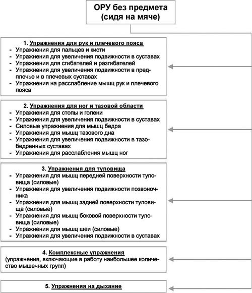 Рис. 4. Классификация ОРУ без предметов, сидя на мяче, по анатомическому признаку Представленная классификация средств фитбол-аэробики дает возможность подобрать и составить определенные комплексы упражнений, выполняемые с музыкальным сопровождением в зависимости от направления педагогических задач: для развития мышечной силы, гибкости, быстроты движений, выносливости, координационных способностей. При этом создаются условия для анатомического воздействия на определенные мышечные группы, суставы, связки, внутренние органы и органы чувств. Первую группу представляют "Гимнастические упражнения" . В нее входят разновидности ходьбы, бега и прыжков, а также общеразвивающие упражнения (ОРУ), выполняемые с целью оздоровления и развития двигательных способностей (рис. 3). Вторую группу упражнений на фитболах составляют "Основные (базовые) движения аэробики". При записи и проведении оздоровительных программ специалисты используют определенные названия (термины) для каждого конкретного движения. Поскольку термины заимствованы из зарубежных источников, используются названия на английском языке. Для простоты обучения занимающихся специалистами была выделена небольшая группа базовых шагов, на основе которых и строятся блоки и комбинации упражнений аэробики (Е.С. Крючек, 2001; Т.А. Кудра, 2001). В фитбол-аэробике можно использовать следующие базовые шаги, которые хорошо адаптируются к специфике проведения упражнений на мяче: - March - марш (шаги на месте) - Step-touch - приставной шаг - Knee-up - колено вверх - Lunge - выпад - Kick - выброс ноги вперед - Jack (jamping jack) - прыжки ноги врозь-вместе - V-step. Основные шаги можно модифицировать и получать сложные по координации связки движений, которые соединяются в интересные комбинации. В группу "Танцевальные упражнения" входят элементы ритмики, хореографии и современных танцев: джаз, рок-н-ролл, диско, фолк, латиноамериканские и др. Группу "Упражнения лечебной физической культуры" составляют средства, направленные на профилактику и коррекцию различных заболеваний внутренних органов, опорно-двигательного аппарата, сердечно-сосудистой, нервной и дыхательной систем организма, органов зрения. Раздел "Подвижные, музыкальные игры и эстафеты " включает большое количество игр как с мячом, так и сидя на мяче ("Музыкальные стулья", игры на внимание и др.) для занятий фитбол-аэробикой с детьми дошкольного и школьного возраста. Эта группа упражнений включает и упражнения креативной гимнастики, способствующие развитию творчества, инициативы и самовыражения. В раздел "Упражнения из других оздоровительных и спортивных видов физической культуры" входят элементы из различных видов спорта. Из спортивных игр могут быть взяты элементы волейбола, баскетбола, футбола и др. Спортивная гимнастика представлена акробатическими упражнениями: перекатами, стойками на лопатках с мячом, мостиком и др. Элементы художественной и атлетической гимнастики также вносят разнообразие в занятия фитбол-аэробикой. Представленный материал дает информацию о многообразии средств нового современного вида фитбол-аэробики, овладение упражнениями которой позволит укрепить здоровье и физическую подготовленность занимающихся, повысить профессионализм инструкторов по фитнесу и оздоровительным видам физической культуры.