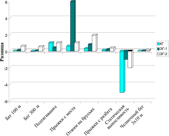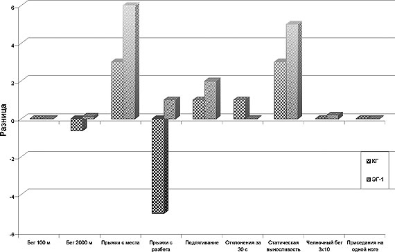 Рис. 2. Уровень изменения в выполнении контрольных упражнений по физической подготовленности студентов КГ и ЭГ за учебный год (девушки) В таком силовом упражнении, как отжимание на брусьях, почти в два раза увеличили результат студенты ЭГ-2 (р<0,05), незначительно ( в 0,8 раза) - студенты ЭГ-1 (р >0,05), и немного улучшился результат в контрольной группе. Результат статической выносливости во всех группах ухудшился. По всей видимости, развитию этого качества уделялось недостаточно времени и необходима корректировка программы занятий по физическому воспитанию. Упражнение "челночный бег 3х10 м" на 0,1 с быстрее стали выполнять студенты ЭГ-1 (р < 0,05) и на 0,3 с - ЭГ-2 (р>0,05), контрольная группа в результате не прибавила. Таким образом, можно заключить, что экспериментальная программа эффективно воздействовала на физическую подготовлен ность студентов ЭГ-2, особенно высокие результаты по окончании эксперимента наблюдались в упражнениях на выносливость, в скоростной и скоростно-силовой подготовленности. О преимуществе эксперимен тальных занятий можно судить и по результату рейтингового контроля (табл. 1). Рейтинг студентов ЭГ-2 увеличился на 77,5 балла, ЭГ-1 - на 30,3 балла, а КГ - на 12 баллов. В педагогическом эксперименте принимали участие две группы студенток: одна контрольная и одна экспериментальная с примерно равным уровнем физической подготовленности. КГ занималась по программе физического воспитания для студентов вузов, а ЭГ - по разработанной нами программе. Изучение динамики уровня физической подготовленности студенток по 9 тестам позволило выявить эффективность экспериментальной программы при физическом воспитании в неблагоприятных экологических условиях. Анализ полученных результатов в беге на 100 м не выявил преимущества ни одной из групп, поскольку прироста подготовлен ности за учебный год не наблюдалось. Однако статистически достоверными были изменения в сторону улучшения у студенток группы ЭГ в беге на 2000 м. Прирост результата равнялся 0,13 с (р<0,05) (рис. 2). Студентки КГ ухудшили результат в беге на 2000 м. Разница составила 0,64 с (р>0,05), что свидетельствует о снижении деятельности механизма обеспечения качества выносливости. Это объясняется тем, что двух месяцев занятий в весеннем семестре на открытом воздухе недостаточно для повышения уровня развития этого качества. Постоянные занятия дыхательной гимнастикой в ЭГ развивают функции дыхательной системы как основы воспитания физического качества "выносливость". В силовой подготовке студенток наблюдалась существенная разница: в ЭГ стали лучше подтягиваться на 2 раза (р<0,01), а в КГ - на 1 раз (р<0,05). В то же время в упражнении "Отклонение назад в положении сидя на гимнастической скамейке, руки за головой", которое выполнялось за 30 с и фиксировалось количество раз, сильнее были студентки группы КГ. У них результат вырос на 1 наклон (р>0,05), в то же время в группе ЭГ изменений не произошло. В приседании на одной ноге изменений не произошло ни в одной из групп. Значительно сильнее были студентки ЭГ в статической выносливости, где результат у них улучшился на 5 с (р < 0,05), против 3 с (р > 0,05) в КГ. В упражнении на быстроту и ловкость, каким является челночный бег 3х10 м, студентки ЭГ повысили результат на 0,2 с (р < 0,01), а в КГ изменений не обнаружено. Следовательно, в шести из девяти контрольных упражнений более высо