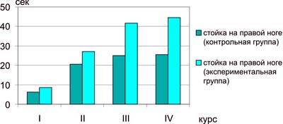 Рис. 1. Динамика развития координационных способностей (на примере статического равновесия) Экспериментальная проверка эффективности коррекции физической подготовленности студентов СМГ с использованием индивидуальных программ, разрабатываемых с участием самих студентов и предлагаемого комплекса информационных средств проводилась в УГТУ-УПИ на протяжении 1997 - 2001 гг. Студентам СМГ контрольных (КГ) и экспериментальных (ЭГ) групп предлагались для выполнения примерно одинаковые упражнения. Основное же отличие заключалось в том, что если студенты КГ занимались по программе, разработанной на кафедре общей и специальной физической подготовки УГТУ-УПИ (предлагаемой им как бы извне), то занимающиеся в ЭГ - по индивидуальным программам, составляемым студентом с помощью преподавателя по заданному алгоритму. Причем по мере повышения заинтересованности, овладения специальными знаниями, приобретенным опытом самостоятельность студентов в работе над программами все более расширялась. Число студентов, занимающихся в ЭГ, как и в КГ, составило около 100 человек. Преобладающие нарушения в состоянии здоровья у них следующие: заболевания мочевыводящих путей, органов дыхания и опорно-двигательного аппарата. У 72% студентов СМГ имелось по одному заболеванию, у 23% - по два и у 5% - по три заболевания. Проведение формирующего исследования сопровождалось систематическим тестированием физической подготовленности, оцениванием физического здоровья, психоэмоционального состояния и уровня владения знаниями в сфере физической культуры и здоровья. При оценивании физической подготовленности применялись следующие тестовые методики: прыжки в длину и высоту с места (оценка скоростно-силовых способностей), "выкрут" в плечевом суставе, отведение рук назад, наклоны туловища вперед из положения сидя (оценка подвижности в суставах), удержание равновесия на одной ноге с закрытыми глазами (оценка координационных способностей), 12-минутный тест ходьбы и бега (оценка выносливости), поднимание туловища из положения лежа на спине, сгибание и разгибание рук в упоре лежа, приседания и подтягивания на перекладине (оценка силовой выносливости). Оценивание физического здоровья проводилось с использованием экспресс-диагностики В.И. Белова и Г.Л. Апанасенко [6, 3]. Кроме того, для оценки функционального состояния сердечно-сосудистой системы применялся тест Руфье, а при изучении степени напряжения механизмов вегетативной регуляции - метод математического анализа сердечного ритма по Р.М. Баевскому [4]. Определение психоэмоционального состояния проводилось на основе психологического тестирования по бланковой методике "Самочувствие - Активность - Настроение (САН)". В начале и в конце каждого учебного года проводилось социологическое исследование, направленное на изучение динамики отношения студентов СМГ к занятиям физической культурой, а также оценивание их теоретической подготовленности. Результаты формирующего лонгитюдного исследования показали, что применение индивидуальных программ, разрабатываемых с участием самих студентов СМГ, позволило значительно улучшить состояние их кондиционной и координационной подготовленности. Так, к окончанию IV курса у студентов ЭГ существенно улучшились показатели выносливости как наиболее важного для создания потенциал