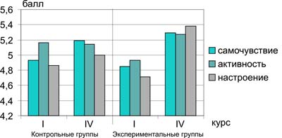 Рис. 2. Динамика изменения показателей самочувствия, активности и настроения Таблица 2. Оценивание знании по основам оздоровительной физической культуры и здоровому образу жизни у студентов контрольных и экспериментальных групп. Динамика изменения уровня физического здоровья