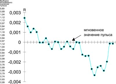 Рис. 1. Автокоррелограмма студентки И. из "слабой" группы в покое. Здесь и далее R - ненормиро ванный коэффициент автокорреляционной функции Результаты. При использовании метода автокорреляционного анализа кардиоинтервалов оказалось возможным выделить периодические составляющие, отражающие аритмию, и подсчитать количество волн на автокорреляционной кривой в покое и после функциональных нагрузок. Анализ автокоррелограмм сердечного ритма в группах студентов, имеющих различную степень физической подготовленности, показал, что аритмия как в покое, так и после функциональных проб, наблюдается у всех лиц. В таблице представлены результаты анализа 30 интервалов R-R у студенток двух групп.