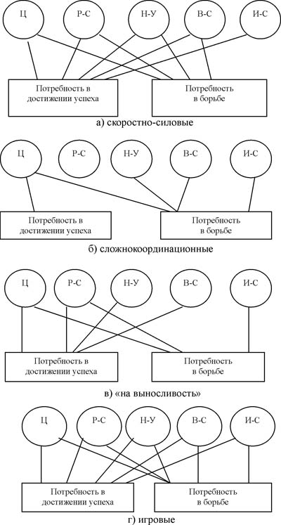 Данные, представленные в табл. 3, показывают детерминированность показателей волевой активности спортсменов разных групп различными симптомокомплексами разноуровневых индивидуальных свойств. В группе спортсменов "на выносливость" проявление волевой активности обусловлено целым рядом показателей личностных качеств (A, C, G, H, M, Q1, Q3, по Р. Кеттеллу - первый фактор) и различными показателями свойств нервной системы (сила и подвижность нервной системы - второй фактор). У спортсменов сложнокоординационных видов спорта проявление волевой активности обусловлено не только показателями личностных качеств (J, Q4) и всех свойств нервной системы, но и мотивацией: потребностью в достижении успеха и потребностью в борьбе. В группе скоростно-силовых видов проявление волевой активности обусловлено как различными показателями свойств нервной системы, личностными качествами (E,G,J,Q2,Q4, по Р. Кеттеллу), так и потребностью в достижении успеха. В группе спортсменов игровых видов проявление волевой активности больше обусловлено мотивацией и свойствами нервной системы и в меньшей степени показателями личностных качеств. Таким образом, теоретический анализ исследований и эмпирические данные в целом подтверждают выдвинутые предположения о том, что волевая активность спортсменов представляет собой целостное образование, разноуровневое и многокомпонентное, структура которого обусловлена спецификой вида спорта и детерминирована в каждом из видов спорта своеобразным симптомокомплексом разноуровневых свойств интегральной индивидуальности. Выводы 1. Волевая активность спортсменов независимо от вида спорта (скоростно-силовых, сложнокоординационных, "на выносливость" и игровых видов) представляет собой сложное целостное образование, разноуровневое и многокомпонентное, направленное на обеспечение высокой эффективности деятельности как в условиях учебно-тренировочных занятий, так и в условиях спортивных соревнований. 2. Психологическая структура волевой активности в спорте включает в себя компоненты различных уровней: психологического (уровень развития волевых качеств в их взаимосвязи), мотивационно-личностного (потребность в достижении и борьбе). 3. Структура волевой активности спортсменов в каждой из групп видов спорта - скоростно-силовых, сложнокоординационных, "на выносливость" и игровых - неодинакова и имеет свои специфические особенности. Это проявляется в том, что в игровых видах спорта доминируют такие волевые качества, как целеустремленность, инициативность и самостоятельность, решительность и смелость. В скоростно-силовых - целеустремленность, инициативность и самостоятельность, решительность и смелость. "На выносливость" - целеустремленность, выдержка и самообладание, настойчивость и упорство, а в сложнокоординационных - настойчивость и упорство, решительность и смелость. 4. Волевая активность спортсменов в каждом виде спорта детерминирована своеобразными симптомокомплексами разноуровневых свойств по-разному. В игровых, сложнокоординационных и скоростно-силовых видах спорта в большей степени нейродинамическими и психодинамическими свойствами, а на выносливость - в большей личностными качествами. 5. Волевая активность спортсменов может быть диагностирована с помощью комплексной методики, включающей в себя "Метод о