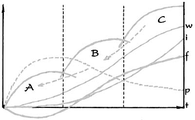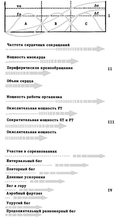 Рис. 2. Принципиальная модель блоковой системы тренировки. А, В и С - блоки тренировочных нагрузок, W - внешняя мощность работы организма, i - интенсивность тренировочной нагрузки, f - функциональное состояние организма, P - общий объем тренировочной нагрузки, t - время тренировки. Объяснение в тексте [24] Следует добавить, что оптимальные условия для повышения интенсивности работы в блоке В создаются долговременным отставленным тренировочным эффектом концентрированных нагрузок СФП, выполняемых в блоке А, а в блоке С - повышенным уровнем мощности (емкости) механизмов энергообеспечения, создаваемым в блоке В. Блок В - принципиально новый элемент по своей роли в программе тренировки. Именно в нем интенсифицируется дистанционная тренировочная работа и начинается переход организма от срочной адаптации к долговременной. Поэтому блок В не следует отождествлять с так называемым "предсоревновательным этапом", который в генеральной стратегии блоковой системы особого значения не имеет.. Как уже говорилось, принципиальная схема блоковой системы (рис. 2) является инвариантной моделью объективно обусловленного и принципиально не изменяемого порядка в организации тренировки, адекватного развитию процесса долговременной адаптации организма спортсмена. Эта модель должна сохранять свою конструктивную идею в любом виде спорта и при любых организационно-временных преобразованиях тренировочного процесса. Профессиональное мастерство тренера заключается в его умении адаптировать эту идею к любому режиму работы организма и календарю соревнований с учетом реального уровня подготовленности спортсмена . Если в годичном цикле два больших адаптационных цикла, они всегда должны четко выделяться во времени при обязательном наличии блока А. Круглогодичная соревновательная деятельность, игнорирующая наличие блока А, в коммерческих интересах не может обеспечить повышения и поддержания адаптационного и энергетического потенциал ов организма длительное время и рано или поздно приведет к истощению того и другого. Примеры использования блоковой системы тренировки. Ниже в качестве примеров приводятся конкретные модели построения тренировки на основе блоковой системы: принципиальной (бег на средние дистанции) и количественной (бег на 100 м). Принципиальная модель тренировки для бегунов на средние дистанции Модель исходит из следующих известных в физиологии мышечной деятельности, биохимии и спортивной медицины, а также из апробированных в современной практике методических положений и принципов ( более подробный см. в обзорах [30, 32, 35, 37, 41, 43 - 45, 47]). 1. Основной принципиальный вывод, к которому приводят все эти сведения, заключается в том, что выносливость определяется не столько количеством кислорода, доставляемого к работающим мышцам, сколько адаптацией самих мышц к длительной напряженной работе. Современные исследования на молекулярном и ультраструктурном уровнях показали, что физиологические механизмы выносливости локализованы в глубинах мышечных клеток. В их основе лежат возможности митохондрий к экстракции более высокого процента кислорода из поступающей артериальной крови. Следовательно, выносливость определяется не столько величиной МПК, сколько "дыхательными" (окислительными) способностями мышц, в том числе развивающихся у их бы