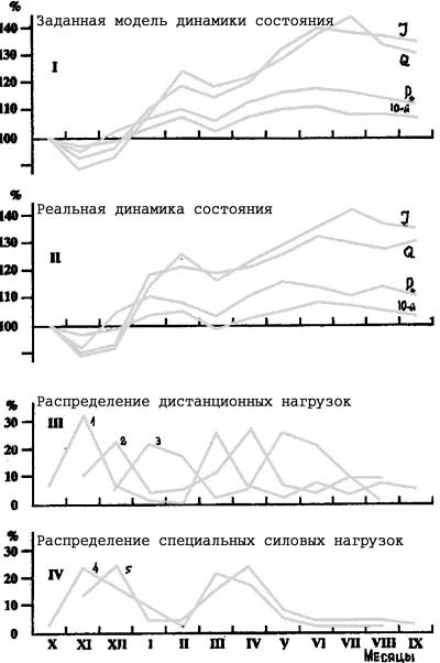 Рис. 3. Качественная модель тренировки бегунов на средние дистанции в большом адаптационном цикле. Объяснение в тексте [35] Количественная модель тренировки спринтеров. Следующий пример демонстрирует количественную модель подготовки спринтеров-мужчин (n=8) - кандидатов в сборную команду СССР к Играм XXII Олимпиады в Москве (тренер А. Корнелюк). Модель включает (рис. 4) два больших адаптационных цикла в году: первый октябрь-февраль, второй февраль-июль, а также разработанные на основе предварительных исследований планируемую (задаваемую) модель динамики состояния спортсменов (I) и модели распределения дистанционных нагрузок (III) и нагрузок специальной физической подготовки (IV), выраженные для каждого месяца в процентах от их годового объема. При создании модели динамики состояния (I), определявш ей содержание и программу тренировки , исходили из принципиальной модели блоковой системы (см. рис. 2), календаря соревнований и ввели показатели взрывной (J), стартовой (Q) и максимальной (P0) силы мышц - разгибателей ног, измеряемой инструментальным методом [23], и результаты 10-кратного прыжка с ноги на ногу с места (10-ного). Основное содержание специальной физической подготовки (график IV) составляли упражнения с отягощением, главным образом со штангой (4) и специализированные прыжковые упражнения (5), выполняемые одновременно с беговыми нагрузками (III) со скоростью 80% (1), 81-90% (2) и 91-100% (3) от максимальной. Скоростная работа (3) выполнялась главным образом на фоне реализации долговременного отставленного тренировочного эффекта нагрузок специальной физической подготовки (4 и 5). Логику организации блоковой системы в данном случае легко понять из предыдущего изложения. Поэтому нет смысла ее подробно рассматривать. Главное, на что важно обратить внимание - это идеальное соответствие реальной динамики состояния спортсмена (II) ее заданной модели (I), что убедительно свидетельствует о высокой практической эффективности рассмотренного в статье способа построения тренировки. Среднегрупповой прирост результата в беге на 100 м в этом случае составил 0,20-0,26 с ( на уровне 10,3-10,5 с11. Заключение. 1. Если обратиться к существующим учебным пособиям по теории тренировки, то в соответствии с современными представлениям о науке и научной деятельности следует ожидать, что эти труды должны отвечать определенным методологическим критериям, характеризующим их как высшую форму научного знания. В частности, они должны базироваться на глубокой профессиональной образованности и представлять не просто сумму разнообразных сведений, излагаемых в произвольной последовательности. По своему строению они должны представлять внутренне дифференцированную, но целостную систему специальных знаний, которую характеризует логическая зависимость одних элементов от других, выводимость содержания теории из некоторой совокупности фактов, утверждений и понятий по определенным логико-методологическим принципам и правилам. Они (учебные пособия) также должны содержать конкретный механизм построения знания, внутреннего развернутого теоретического содержания и воплощать некоторую программу исследования в данной области знания. Методология в общем смысле - это система принципов и способов построения теории и практической деятельности, а также учение об этой системе. В современной мето