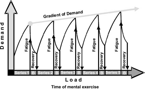 Анита Хёкельман Большой интерес для науки, изучающей движение, представляет вопрос о степени отражения танцевального опыта в воображении танцоров. Знания о танце могут быть извлечены из так называемой эксплицитной памяти и затем усилены посредством сенсорных элементов эмоциональной памяти. Мысленная оценка результатов может отражаться, кроме всего прочего, как на нервной мозговой деятельности, так и на физиологических функциях сердечной и респираторной деятельности (Roth, 2001). В нейропсихологии воспроизведение в сознании такого явления, как танец, известно как репрезентация. Дамасио (2000) применяет этот термин как синоним воображения и нервных паттернов. Как воображение репрезентация проявляется в когнитивных процессах, как нервные паттерны - в нервных связях. Техника танца с ее пространственно-временной и динамичной структурой является одним из примеров объекта репрезентации такого типа. Знания техники при необходимости можно извлечь из памяти. При наличии многих параллелей между когнитивными и нервными процессами процессы, происходящие в мозгу, которые ассоциируются с мышлением, воображением и вниманием, можно увидеть благодаря электрической активности задействованной нервной сети. Интенсивное воспроизведение опыта также оказывает влияние на другие физиологические функции, которые становятся еще одним признаком высших психических процессов. Учитывая все вышесказанное и более общий вопрос, поставленный в начале статьи, мы можем, таким образом, задать следующий более узкий вопрос: "Приводит ли процесс многократного мысленного воображения танцевальной хореографии к изменениям в кортикальной и нервной деятельности танцоров в результате связанной с этим процессом потребности ЦНС и в какой степени это воспроизведение влияет на сердечную, респираторную и мышечную системы?" Полезной теоретической исходной точкой при ответе на этот вопрос является концепция потребности и нагрузки физиологии труда Ромера (1984). По этой концепции нагрузка является причиной потребности. В 1991 г. на конференции Немецкой ассоциации спортивной науки Уиллимсик Даугз и Оливье предложили применить эту концепцию в области спортивной науки движения. Ссылаясь на Лаурига, авторы привели хорошо известный в науке о труде феномен увеличения потребности при неменяющейся нагрузке и уменьшении психических и физических ресурсов по причине утомления. В последующие годы их предложение существенно повлияло на процессы подготовки и тренировки. Шнабель (2003), например, также предложил, что во время тренировочной нагрузки потребность изменяется, что, в свою очередь, вызывает утомление. Таким образом, увеличение отклонения от гомеостаза иногда сопровождается снижением результативных способностей. Это вызывает ослабление концентрации, реакции и регуляции движений, что приводит к ослаблению контроля за действиями и к сокращению позитивной регуляции и энергетической мобилизации. Следующая временная модель мысленного воспроизведения танцевальной хореографии может быть взята за основу для объяснения этих предположений (рис. 1):