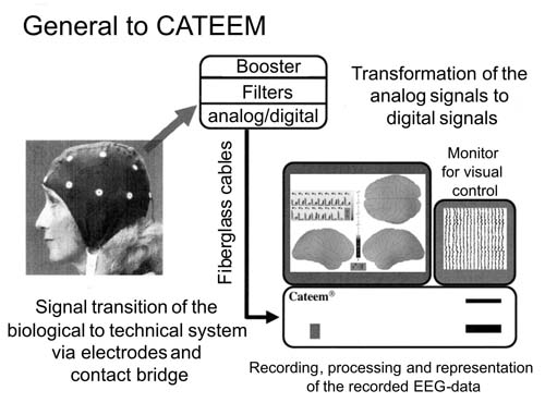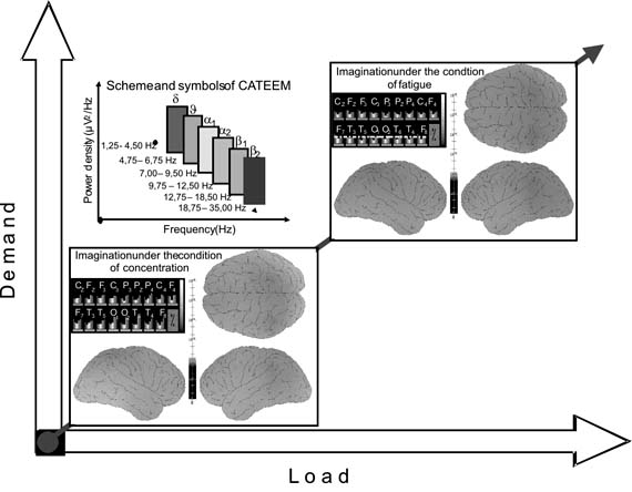 Рис. 1. Взаимосвязь нагрузки и потребности в условиях мысленного упражнения Как считает Шопнфлуг (1987), потребность можно рассматривать как использование ограниченной по силе функции. Активация функции памяти во время мысленных ассоциаций требует для выполнения данной задачи определенной части этой функции. Следовательно, для других видов деятельности функция может использовать только свою оставшуюся не задействованной часть. Снижение функциональной способности наблюдается ограниченный период времени, в зависимости от интенсивности и продолжительности потребности. Что касается проблемы данного исследования, то нас интересовала психическая (когнитивная) потребность. Методы. Субъектами исследования являлись 7 танцоров труппы. Они получили задание мысленно, в воображении, с закрытыми глазами воспроизвести танец. Для всех танцоров использовалась одинаковая хореография. Продолжительность каждого периода нагрузки была равна продолжительности танца, а именно 120 с. Всего было предусмотрено 8 периодов нагрузки с 5-минутными перерывами между ними. Для исчисления общей потребности в первом периоде нагрузки, требующем наибольшей концентрации, применялась средняя величина. После эксперимента танцоры описали свои ощущения потребности. В качестве показателя потребности ЦНС была выбрана кортикальная поверхностная активность. В научных исследованиях, описывающих эксперименты в области науки труда, приводится много примеров реакции на различных частотах ЭЭГ в зависимости от отношения величины нагрузки к скорости и сложности задания (Luczak, 1987). Для регистрации поверхностной активности использовалась система приборов КАТЭЭМ (компьютерной топографической электро-энцефалометрии) компании "МедиСист" (рис. 2). Для измерения электрической активности большого числа нервных клеток во время ЭЭГ применялись поверхностные электроды на теменной области (Cooperetal, 1984; Muhlau, 1990; Ebe, Homma, 1994). Субкортикальные процессы невозможно зарегистрировать непосредственно с помощью ЭЭГ. При использовании ЭЭГ распространение возбуждения в церебральном кортексе во время когнитивного воспроизведения может быть с точностью выражено временными показателями. С помощью системы КАТЭЭМ также можно измерить параметры сердечной, респираторной и мышечной активности в качестве дополнительных показателей психофизической потребности и совместить их с кортексной активностью.
