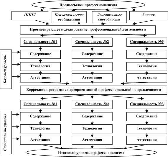 Моделирование ППН на основе дифференцированного подхода к обучению по специализации Таким образом, первым компонентом и залогом успешности профессионального обучения является качественная, по возможности наиболее точная оценка потенциальных способностей поступающих в вуз к той или иной педагогической деятельности. Для этого необходимо использовать комплексный подход, основанный на предварительном тестировании двигательной и теоретической подготовленности, ППНЛ, индивидуально-психологических особенностей. Перевод полученных количественных показателей в единую балльную систему оценок позволит получить интегральный показатель профессиональной пригодности. С помощью последнего можно успешно распределять студентов по соответствующим уровням обучения и разработать необходимые для достижения конкретного результата технологии обучения (второй компонент). Было успешно использовано программированное обучение, которое представляет собой одно из перспективных направлений оптимизации существующего обучения [4, 5]. Эта дидактическая система включала в себя комплекс взаимосвязанных и взаимообусловленных проблем, касающихся программирования содержания профессионального обучения ("Чему учить?" "Что формировать?"), программирования процесса освоения учебного материала ("Как формировать?") и соответствующей организации самостоятельной работы студентов в условиях обучения высшей школы. Взяв за основу предписание алгоритмического типа, мы разделили весь учебный материал (специализация "гимнастика ") на части (дозы, порции, учебные задания). Обучение студентов осуществлялось в строго определенной последовательности по определенной для каждого уровня программе. Только овладение определенным уровнем допускало переход в более высокий (по желанию). При таком подходе не было не умеющих выполнять двигательные действия, не способных решить какую-либо теоретическую или методическую задачу и появлялась возможность неформального учета индивидуальных особенностей студентов, их готовности к выполнению заданий, более узкой профессиональной направленности, в дальнейшем развитии творческих способностей у каждого студента на своем уровне. Например, в содержание базового уровня подготовленности (1-5-й семестры) по разделу "Основы техники гимнастических упражнений" включены задания по формированию базовых умений спортивной направленности, базовых упражнений по видам многоборья, а также на основе этого конструирование и демонстрацию комбинаций различных уровней сложности. Студентам низшего уровня подготовленности (прогноз будущей деятельности - инструктор по физвоспитанию, фитнесу) предлагалось освоение и конструирование наиболее простых упражнений базовой подготовки, от которых зависит безопасность выполнения движений бытового характера и здоровье занимающихся (мягкое, устойчивое приземление, динамическая осанка в перекатах, элементарное освоение стойки как основы правильной осанки и т.д.). Студенты высшего уровня подготовленности (прогноз будущей деятельности - тренер по спортивной гимнастике) совершенствовали необходимые для достижения высоких спортивных результатов базовые навыки, конкретизировали биомеханические различия в выполняемых ими профилирующих упражнениях (отталкивание руками в перевороте